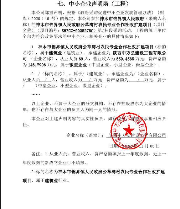四、主要标的信息合同包1(公草湾村农民专业合作社改扩建项目): 工程类(陕西中方弘建设工程有限公司)