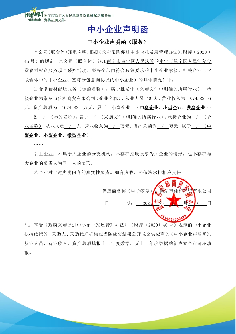 一、项目编号:NNZC2025-C3-991258-GSZB 二、项目名称:南宁市邕宁区人民法院食堂食材配送服务项目 三、中标(成交)信息 1.中标结果: | 序号 | 中标(成交)金额(元) | 中标供应商名称 | 中标供应商地址 | | 1 | 报价:15(%) | 崇左市佳和商贸有限公司 | 广西壮族自治区崇左市江州区东盟大道51-1号崇左万象汇W213号商铺 |
