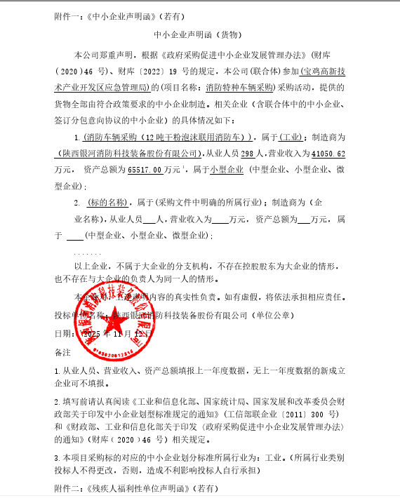 公告概要:| 公告信息: | | 采购项目名称 | 消防特种车辆采购 | | 品目 | | | 采购单位 | 宝鸡高新技术产业开发区应急管理局 | | 行政区域 | 宝鸡高新区 | 公告时间 | 2025年11月13日 10:21 | | 评审专家名单 | 易博,张小江,王秋萍,段永明,于党群 | | 总中标金额 | ¥96.600000 万元(人民币) | | 联系人及联系方式: | | 项目联系人 | 张亚红 | | 项目联系电话 | 13319178519 | | 采购单位 | 宝鸡高新技术产业开发区应急管理局 | | 采购单位地址 | 宝鸡市高新大道69号高新大厦 | | 采购单位联系方式 | 15891387636 | | 代理机构名称 | 宝鸡福美特项目管理有限公司 | | 代理机构地址 | 宝鸡市金台区行政东路三迪金融中心8楼 | | 代理机构联系方式 | 13319178519 | | 附件: | | 附件1 | 宝鸡高新技术产业开发区应急管理局消防特种车辆采购中标(成交)明细.pdf | | 附件2 | 消防特种车辆采购招标文件.pdf | | 附件3 | 中小企业声明函.png |