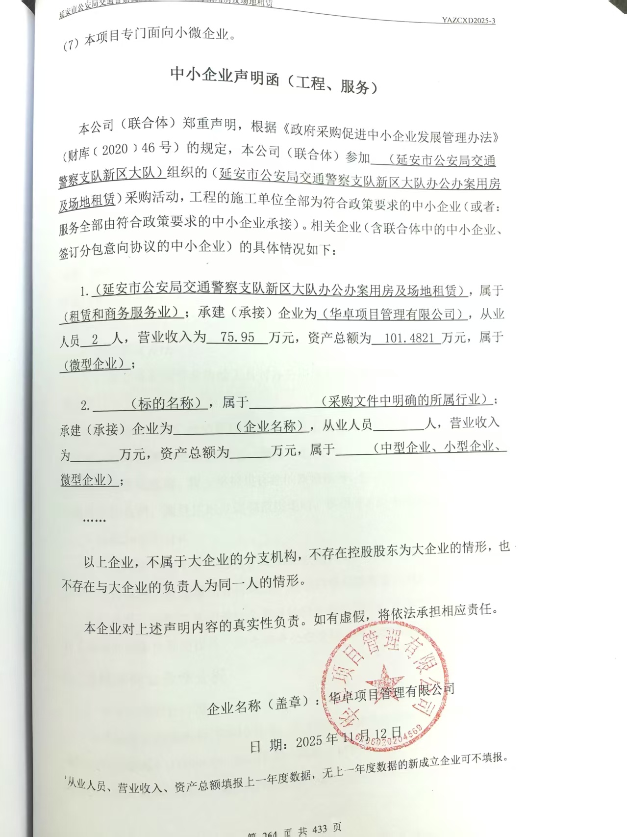 公告概要:| 公告信息: | | 采购项目名称 | 办公办案用房及场地租赁项目 | | 品目 | | | 采购单位 | 延安市公安局交通警察支队新区大队 | | 行政区域 | 延安市 | 公告时间 | 2025年11月14日 11:39 | | 评审专家(单一来源采购人员)名单 | 王延波,王永丽,冯为 | | 总成交金额 | ¥140.000000 万元(人民币) | | 联系人及联系方式: | | 项目联系人 | 高女士 | | 项目联系电话 | 0911-7092221 | | 采购单位 | 延安市公安局交通警察支队新区大队 | | 采购单位地址 | 延安市新区行知南路 | | 采购单位联系方式 | 15991128494 | | 代理机构名称 | 延安市市直单位政府采购中心 | | 代理机构地址 | 陕西省延安市宝塔区延安市新区为民服务中心南区东楼(7号楼)A2楼 | | 代理机构联系方式 | 0911-7092253 | | 附件: | | 附件1 | 中小企业声明函.jpg | | 附件2 | 延安市公安局交通警察支队新区大队办公办案用房及场地租赁项目中标(成交)明细.pdf |