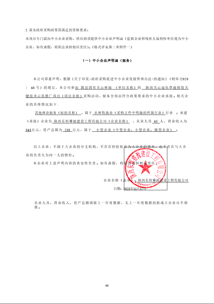 公告概要:| 公告信息: | | 采购项目名称 | 陕西关山退化草地修复关键技术示范推广项目 | | 品目 | | | 采购单位 | 陇县国有关山林场 | | 行政区域 | 陇县 | 公告时间 | 2025年11月18日 11:45 | | 评审专家(单一来源采购人员)名单 | 李新文,朱琦,谢宏安 | | 总成交金额 | ¥77.730000 万元(人民币) | | 联系人及联系方式: | | 项目联系人 | 杨克军 | | 项目联系电话 | 0917-3235808 | | 采购单位 | 陇县国有关山林场 | | 采购单位地址 | 陇县天成镇铁塬村 | | 采购单位联系方式 | 0917-4658014 | | 代理机构名称 | 陕西鑫盛龙泽项目管理有限公司 | | 代理机构地址 | 宝鸡市高新开发区华厦悦世界壹空间14层1408室 | | 代理机构联系方式 | 0917-3235808 | | 附件: | | 附件1 | 陇县国有关山林场陕西关山退化草地修复关键技术示范推广项目中标(成交)明细.pdf | | 附件2 | 二次报价.pdf | | 附件3 | 磋商文件.pdf | | 附件4 | 中小企业声明函.png |