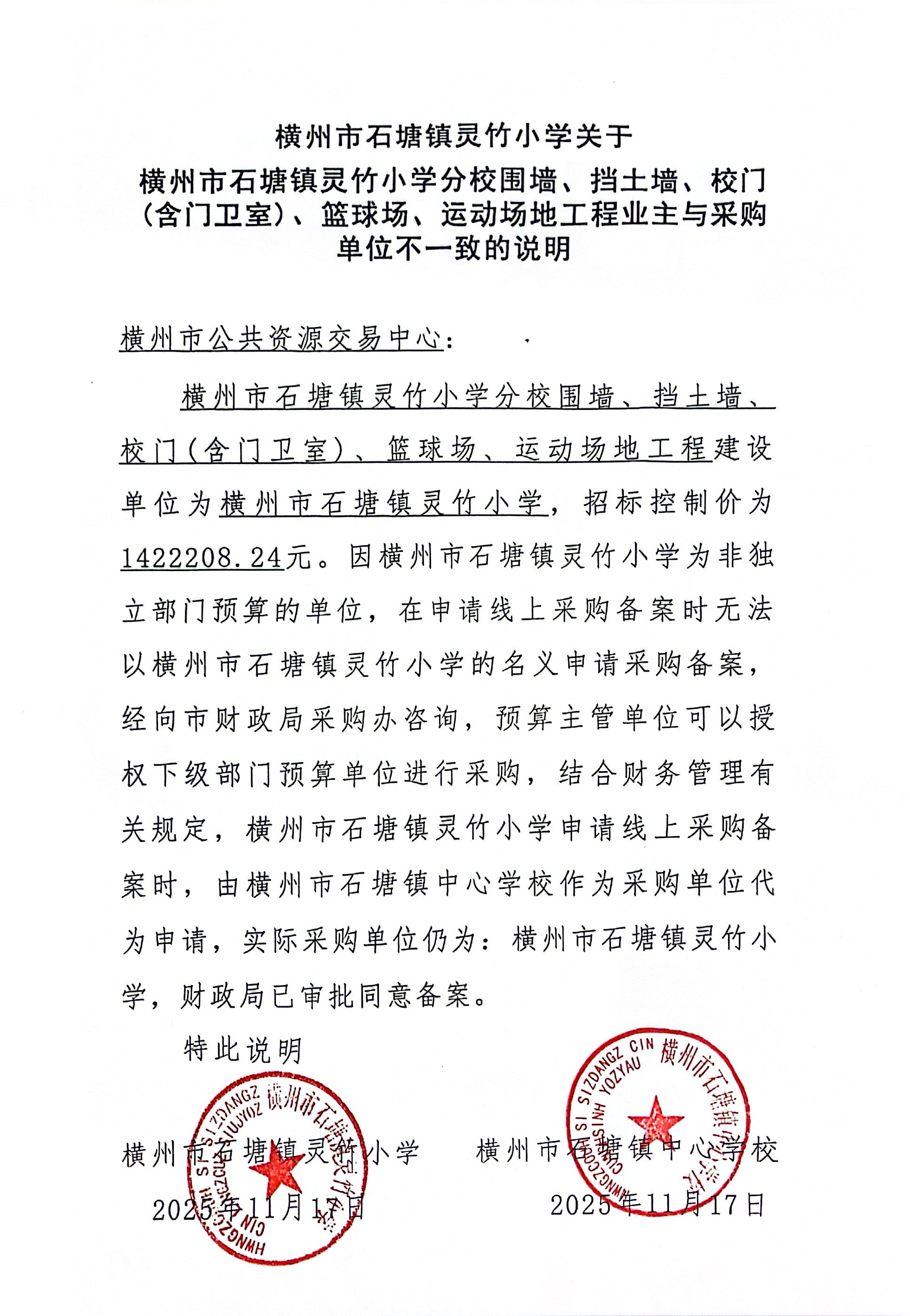公告概要:| 公告信息: | | 采购项目名称 | 横州市石塘镇灵竹小学分校围墙、挡土墙、校门(含门卫室)、篮球场、运动场地工程 | | 品目 | | | 采购单位 | 横州市石塘镇中心学校 | | 行政区域 | 广西壮族自治区 | 公告时间 | 2025年11月18日 17:29 | | 获取采购文件时间 | 2025年11月18日至2025年12月01日 每日上午:00:00 至 12:00 下午:12:00 至 23:59(北京时间,法定节假日除外) | | 响应文件递交地点 | 请登录广西政府采购云平台投标客户端投标 | | 响应文件开启时间 | 2025年12月01日 09:30 | | 响应文件开启地点 | 广西政府采购云平台 | | 预算金额 | ¥142.220824万元(人民币) | | 联系人及联系方式: | | 项目联系人 | 张工 | | 项目联系电话 | 0771-3159590 | | 采购单位 | 横州市石塘镇中心学校 | | 采购单位地址 | 横州市石塘镇灵竹社区灵竹街 | | 采购单位联系方式 | 0771-7173172 | | 代理机构名称 | 广西达元工程管理有限责任公司 | | 代理机构地址 | 南宁市青秀区通达东路1号凤岭综合客运枢纽站长途客运站第五层D501、D502 | | 代理机构联系方式 | 0771-3159590 |