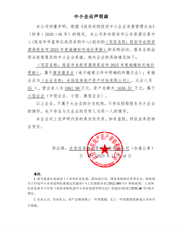 公告概要:| 公告信息: | | 采购项目名称 | 延安市2025年度城镇标定地价更新项目 | | 品目 | | | 采购单位 | 延安市自然资源局 | | 行政区域 | 延安市 | 公告时间 | 2025年11月19日 16:40 | | 评审专家(单一来源采购人员)名单 | 张石磊,崔淑仙,冯为 | | 总成交金额 | ¥49.710000 万元(人民币) | | 联系人及联系方式: | | 项目联系人 | 高女士 | | 项目联系电话 | 09117092221 | | 采购单位 | 延安市自然资源局 | | 采购单位地址 | 为民服务中心综合楼420 | | 采购单位联系方式 | 0911-7090420 | | 代理机构名称 | 延安市公共资源交易中心(延安市市直单位政府采购中心) | | 代理机构地址 | 陕西省延安市宝塔区延安市新区为民服务中心南区东楼(7号楼)A2楼 | | 代理机构联系方式 | 0911-7092253 | | 附件: | | 附件1 | 延安市自然资源局延安市2025年度城镇标定地价更新项目中标(成交)明细.pdf | | 附件2 | 中小企业声明函.png |