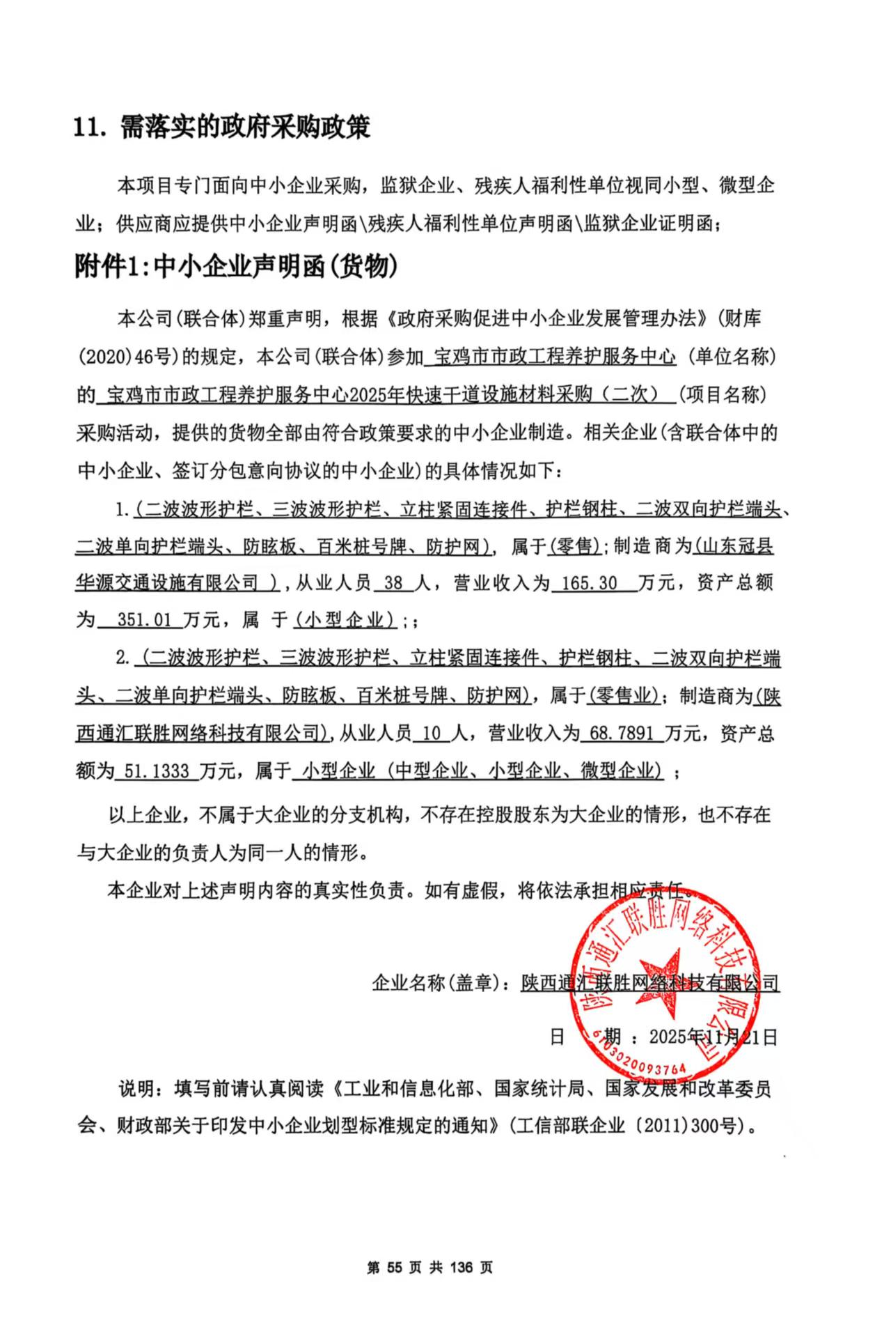 四、主要标的信息合同包1(宝鸡市市政工程养护服务中心2025年快速干道设施材料采购): 货物类(陕西通汇联胜网络科技有限公司)