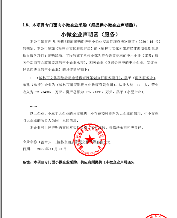 四、主要标的信息合同包1(榆林市文化和旅游局非遗微短剧策划执行服务项目): 服务类(榆林市雨辰影视文化传媒有限公司)