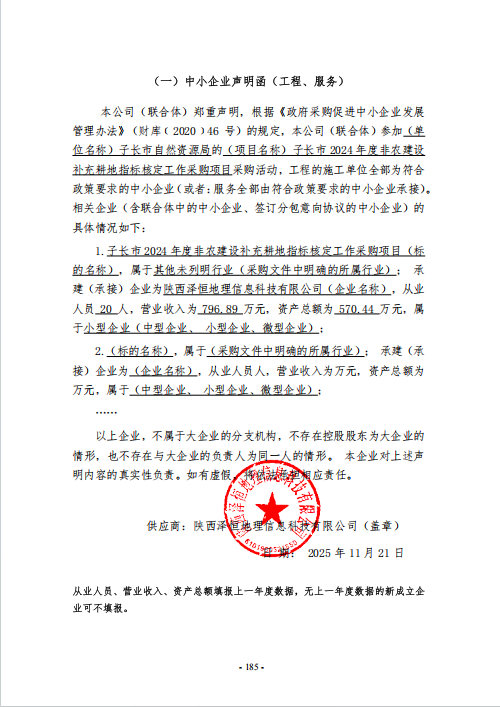 一、项目编号:YADC-2025-032 二、项目名称:子长市2024年度非农建设补充耕地指标核定工作采购项目 三、采购结果 采购包1: | 供应商名称 | 供应商地址 | 中标(成交)金额 | 评审总得分 | | 陕西泽恒地理信息科技有限公司 | 陕西省西安市高新区沣惠南路34号摩尔中心2幢10802 | 788,500.00元 | 96.00 | 四、主要标的信息 合同包1(子长市2024年度非农建设补充耕地指标核定工作采购项目): 服务类(陕西泽恒地理信息科技有限公司) | 品目号 | 品目名称 | 采购标的 | 服务范围 | 服务要求 | 服务时间 | 服务标准 | 金额(元) | | 1 | 其他专业技术服务 | 子长市2024年度非农建设补充耕地指标核定工作采购项目 | 2024年度非农建设补充耕地指标核定工作 | 符合国家、省、市及地方现行有关行业规范标准 | 自合同签订之日起180天 | 符合国家、省、市及地方现行有关行业规范标准 | 788,500.00 | 五、评审专家(单一来源采购人员)名单: 六、代理服务收费标准及金额: | 代理服务收费标准及金额 | 参照国家计委颁发的《招标代理服务收费管理暂行办法》(计价格[2002]1980号)和国家发改委办公厅颁发的《关于招标代理服务收费有关问题的通知》(发改办价格【2003】857号)规定的收费标准以及发改价格『2011』534号文中规定的标准计取 | | 合同包号 | 合同包名称 | 代理服务费金额(万元) | 收取对象 | | 1 | 子长市2024年度非农建设补充耕地指标核定工作采购项目 | 1.1827 | 中标(成交)供应商 | 七、公告期限 自本公告发布之日起1个工作日。 八、其他补充事宜 本项目结果公告在《陕西省政府采购网》、《全国公共资源交易平台(陕西省·延安市》同时发布。 九、凡对本次公告内容提出询问,请按以下方式联系。 1.采购人信息 名称:子长市自然资源局 地址:子长市齐家湾旧粮站 联系方式:0911-7113944 2.采购代理机构信息 名称:延安鼎诚项目管理有限公司 地址:陕西省延安市新区金圣国际6号楼1单元4层 联系方式:0911-2898989 3.项目联系方式 项目联系人:袁海琴 电话:0911-2898989 延安鼎诚项目管理有限公司 2025年11月24日 |