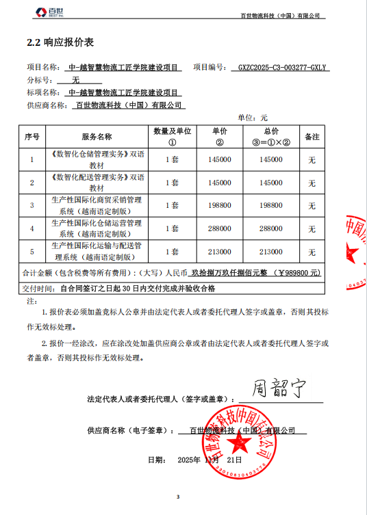 一、项目编号:GXZC2025-C3-003277-GXLY 二、项目名称:中-越智慧物流工匠学院建设项目 三、中标(成交)信息 1.中标结果: | 序号 | 中标(成交)金额(元) | 中标供应商名称 | 中标供应商地址 | | 1 | 报价:989800(元) | 百世物流科技(中国)有限公司 | 浙江省杭州市滨江区长河街道江南大道588号23层2310室 |
