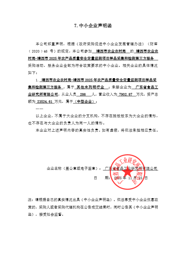公告概要:| 公告信息: | | 采购项目名称 | 靖西市农业农村局-靖西市2025年农产品质量安全定量监测项目样品采集和检测第三方服务 | | 品目 | | | 采购单位 | 靖西市农业农村局 | | 行政区域 | 广西壮族自治区 | 公告时间 | 2025年11月26日 11:58 | | 评审专家(单一来源采购人员)名单 | 黎国斌,田春玲,梁宏锋(第1分标采购人代表) | | 总成交金额 | ¥105.880000 万元(人民币) | | 联系人及联系方式: | | 项目联系人 | 邓凤蓉 | | 项目联系电话 | 0776-6120050 | | 采购单位 | 靖西市农业农村局 | | 采购单位地址 | 靖西市新靖镇绣球大道751号 | | 采购单位联系方式 | 0776-6212195 | | 代理机构名称 | 广西万丰项目管理有限公司 | | 代理机构地址 | 靖西市云天城A6栋1012号 | | 代理机构联系方式 | 0776-6120050 |