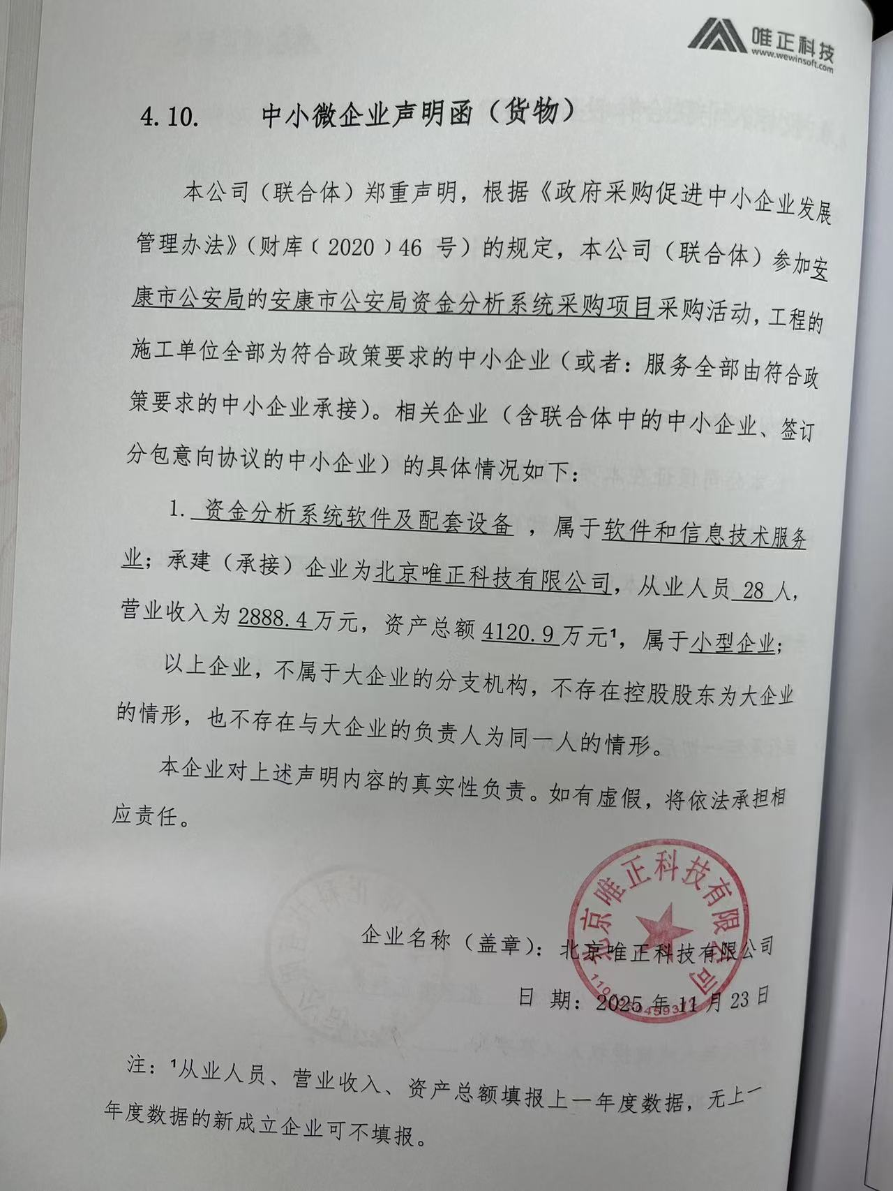 公告概要:| 公告信息: | | 采购项目名称 | 资金分析系统采购 | | 品目 | | | 采购单位 | 安康市公安局 | | 行政区域 | 安康市 | 公告时间 | 2025年11月27日 11:12 | | 评审专家(单一来源采购人员)名单 | 邱辰阳,周丹,邹春燕 | | 总成交金额 | ¥19.890000 万元(人民币) | | 联系人及联系方式: | | 项目联系人 | 郑工 | | 项目联系电话 | 13991519725 | | 采购单位 | 安康市公安局 | | 采购单位地址 | 安康市高新区安康大道30号 | | 采购单位联系方式 | 13389153369 | | 代理机构名称 | 安康尚昊招标代理有限公司 | | 代理机构地址 | 安康市高新区高新观澜8栋2单元801室 | | 代理机构联系方式 | 13991519725 | | 附件: | | 附件1 | 中小企业声明函.jpg | | 附件2 | 市公安局分析系统--谈判文件限下(定稿).docx | | 附件3 | 安康市公安局资金分析系统采购中标(成交)明细.pdf |