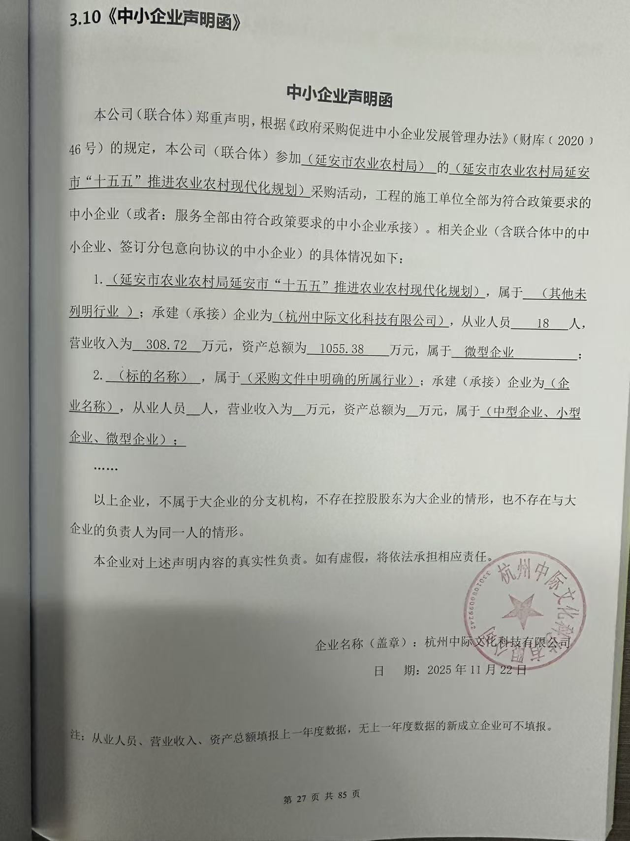 一、项目编号:SXYS-2025-051 二、项目名称:延安市“十五五”推进农业农村现代化规划 三、采购结果 采购包1: | 供应商名称 | 供应商地址 | 中标(成交)金额 | 评审总得分 | | 杭州中际文化科技有限公司 | 浙江省杭州市滨江长河街道塘子堰路199号5楼540室 | 491,500.00元 | 89.17 | 四、主要标的信息 合同包1(延安市农业农村局延安市“十五五”推进农业农村现代化规划): 服务类(杭州中际文化科技有限公司) | 品目号 | 品目名称 | 采购标的 | 服务范围 | 服务要求 | 服务时间 | 服务标准 | 金额(元) | | 1 | 其他专业技术服务 | 其他专业技术服务 | 采购文件所有内容及要求 | 符合采购文件所有内容及要求 | 一年 | 合格 | 491,500.00 | 五、评审专家(单一来源采购人员)名单: 六、代理服务收费标准及金额: | 代理服务收费标准及金额 | 本项目采购代理服务费按《招标代理服务收费管理暂行办法》(计价格〔2002〕1980号)、《国家发展改革委关于降低部分建设项目收费标准规范收费行为等有关问题的通知》(发改价格〔2011〕534号)标准计算. | | 合同包号 | 合同包名称 | 代理服务费金额(万元) | 收取对象 | | 1 | 延安市农业农村局延安市“十五五”推进农业农村现代化规划 | 0.7372 | 中标(成交)供应商 | 七、公告期限 自本公告发布之日起1个工作日。 八、其他补充事宜 九、凡对本次公告内容提出询问,请按以下方式联系。 1.采购人信息 名称:延安市农业农村局 地址:新区市政府206室 联系方式:15891114132 2.采购代理机构信息 名称:陕西延审工程项目管理有限公司 地址:延安市新区嘉宁万兴花园写字楼21层 联系方式:0911-2114641 3.项目联系方式 项目联系人:郝小艳 电话:19929659892 陕西延审工程项目管理有限公司 2025年11月27日 |