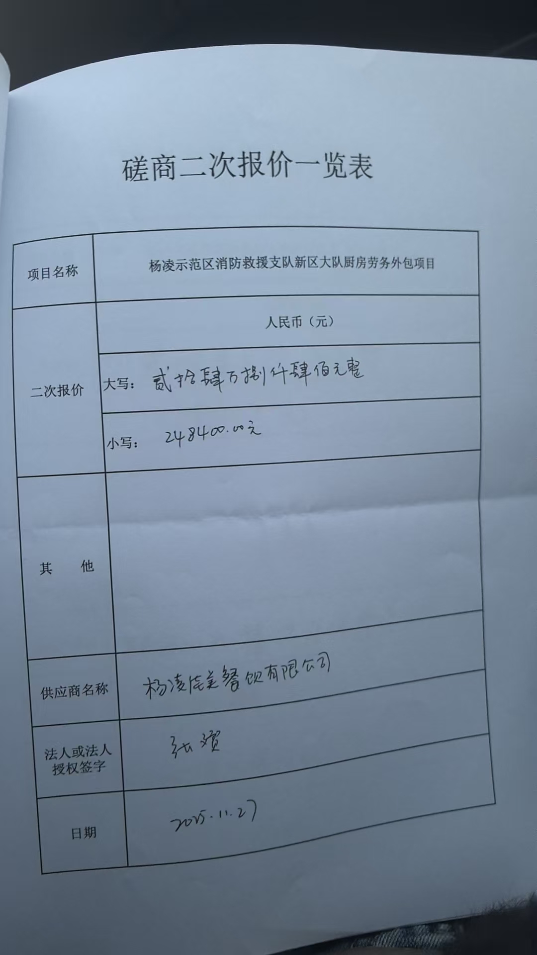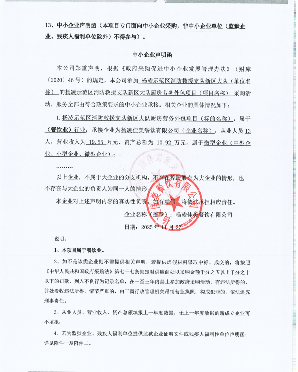 公告概要:| 公告信息: | | 采购项目名称 | 厨房劳务外包项目 | | 品目 | | | 采购单位 | 杨凌示范区消防救援支队新区大队 | | 行政区域 | 杨陵区 | 公告时间 | 2025年11月28日 08:49 | | 评审专家(单一来源采购人员)名单 | 席睿睿,薛世雄,余利民 | | 总成交金额 | ¥24.840000 万元(人民币) | | 联系人及联系方式: | | 项目联系人 | 闫工 | | 项目联系电话 | 18202984436 | | 采购单位 | 杨凌示范区消防救援支队新区大队 | | 采购单位地址 | 陕西省杨凌示范区东新路5号杨凌消防救援支队 | | 采购单位联系方式 | 029-87033806 | | 代理机构名称 | 陕西玖聚常安咨询有限公司 | | 代理机构地址 | 陕西省西安市未央区陕西省西安市经济技术开发区凤城十二路富北高银28幢2单元1718室 | | 代理机构联系方式 | 18202984436 | | 附件: | | 附件1 | 二次报价表.jpg | | 附件2 | 中小企业声明函.png |