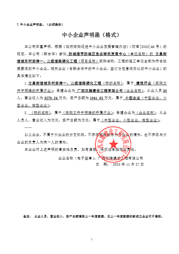 2.废标结果: 四、主要标的信息 工程类主要标的信息: | 序号 | 标项名称 | 标的名称 | 施工范围 | 施工工期 | 项目经理 | 执业证书信息 | | 1 | 文昌街道城东村那傍一、二组道路硬化工程 | 文昌街道城东村那傍一、二组道路硬化工程 | 新建水泥路面2890m、水泥路面宽3.5m,新建1-Φ0.5m钢筋混凝土圆管涵54.0m,LED太阳能路灯160.0盏及项目竣工标牌等。详见施工图纸及工程量清单。 | 120日历天 | 黄富 | 桂245212201923 | 五、评审专家(单一来源采购人员)名单: 苏兴旺(第1分标采购人代表),唐春蕊,黄再雍 六、代理服务收费标准及金额: 1.代理服务收费标准:按采购文件规定的收费计算标准(工程类)采用差额定率累进法计算出收费基准价格,由成交人在领取成交通知书时一次性向采购代理机构支付。 2.代理服务收费金额(元):16118 七、公告期限 自本公告发布之日起1个工作日。 八、其他补充事宜 1.供应商认为成交结果使自己的权益受到损害的,可以在成交结果公告期限届满之日起七个工作日内以书面形式向采购人或采购代理机构提出质疑,逾期将不再受理。 2.网上查询地址:中国政府采购网、广西壮族自治区政府采购网、全国公共资源交易中心(广西·防城港)、广西防城港防城区人民政府门户网站。 3.成交供应商评审总得分:86.67分。 4.监督部门:防城港市防城区政府采购中心;联系电话:0770-2213681。 九、对本次公告内容提出询问,请按以下方式联系 1.采购人信息 名 称:防城港市防城区发展和改革局 地 址:防城港市防城区防北路112号 联系方式:0770-2035236 2.采购代理机构信息 名 称:广西建基项目管理顾问有限公司 地 址:防城港市港口区沙潭江街道办豪丫市场综合配套区第2组1栋4号房3楼 联系方式:0770-2816668 3.项目联系方式 项目联系人:郑锡贵 电 话:0770-2816668 附件信息: |