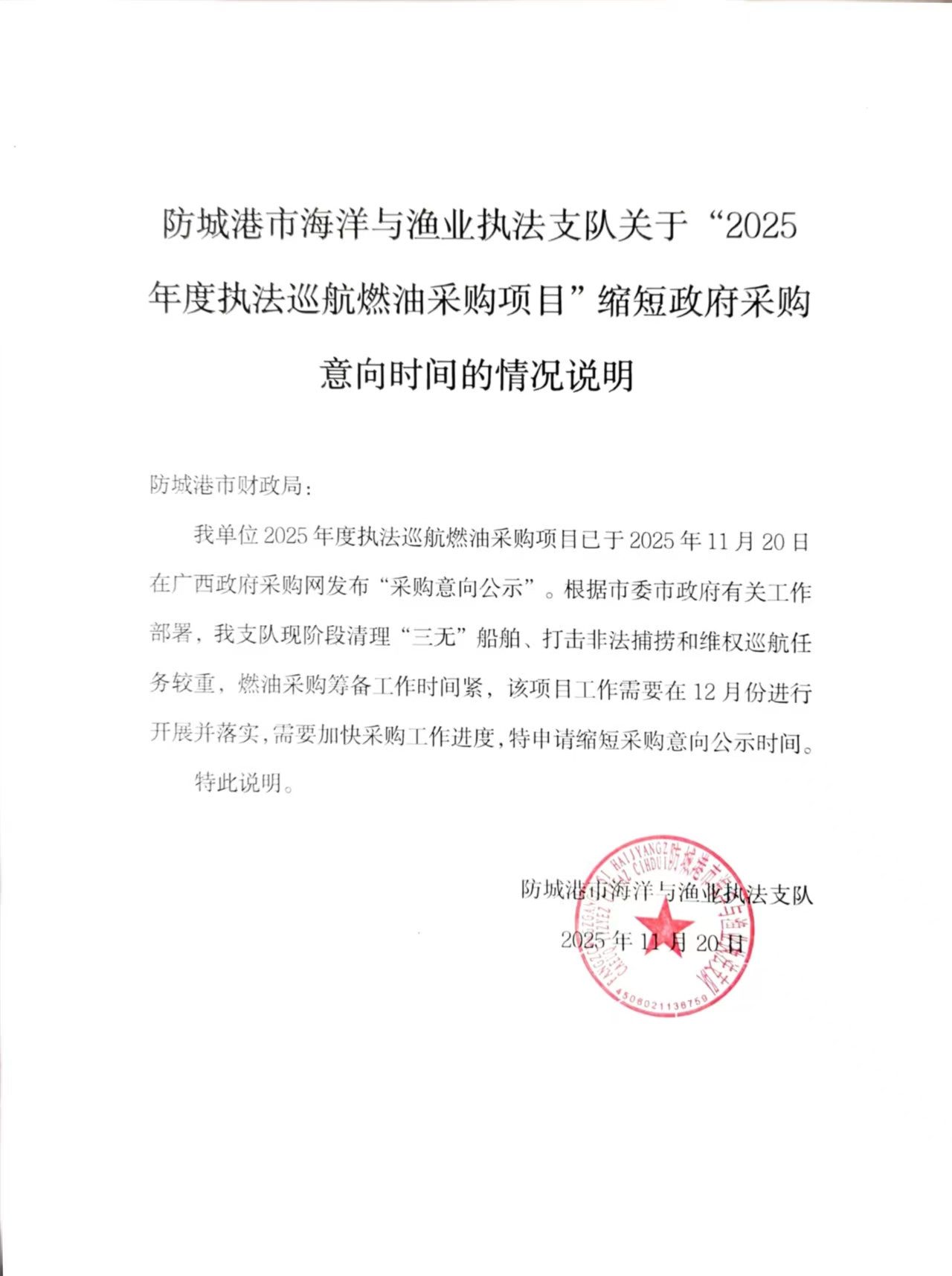 2025年度执法巡航燃油采购项目采购项目的潜在供应商应在广西政府采购云平台获取采购文件,并于2025年12月04日 13:30(北京时间)前提交响应文件。