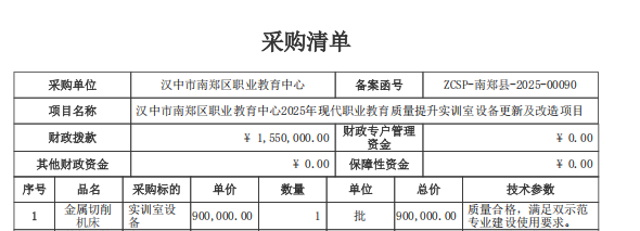 项目概况2025年现代职业教育质量提升实训室设备更新及改造项目(二次)的潜在投标人应在陕西省政府采购综合管理平台项目电子化交易系统(以下简称“项目电子化交易系统”)获取招标文件,并于 2025年12月22日 14时00分 (北京时间)前递交投标文件。 一、项目基本情况项目编号:ZCSP-南郑县-2025-00090.1B1 项目名称:2025年现代职业教育质量提升实训室设备更新及改造项目(二次) 采购方式:公开招标 预算金额:900,000.00元 采购需求:详见采购需求附件 合同履行期限: 采购包1:45天 本项目是否接受联合体投标: 采购包1:不接受联合体投标 二、申请人的资格要求:1.满足《中华人民共和国政府采购法》第二十二条规定; 2.落实政府采购政策需满足的资格要求: 无。 3.本项目的特定资格要求: 合同包1(数控实训工厂改造)特定资格要求如下: (1)具有独立承担民事责任能力的法人、其他组织或自然人,并出具合法有效的营业执照或事业单位法人证书等国家规定的相关证明,自然人参与的提供其身份证明; (2)法定代表人参加投标须提供《法定代表人身份证明》及身份证复印件;法定代表人授权他人参加投标,须提供《法定代表人授权委托书》、委托代理人身份证复印件; (3)供应商资格承诺函:供应商具有良好的商业信誉和健全的财务会计制度,具有履行合同所必需的设备和专业技术能力,具有依法缴纳税收和社会保障金的良好记录,参加本项目采购活动前三年内无重大违法活动记录 ,未列入在信用中国网站“失 信被执行人”、“重大税收违法案件当事人名单”中(www.creditchina.gov.cn),也未列入中国政府采购网“政府采购严重违法失信行为记录名单”中 www. ccgp.gov.cn );(供应商应按照汉中市财政局《关于全面推行政府采购供应商基本资格条件承 诺制的通知》(汉采办采管〔2024〕20号)文件要求,需提供加盖公章的《汉中市政府采购供应商资格承诺函》); (4)本项目不接受联合体投标,单位负责人为同一人或者存在直接控股、管理关系的不同投标人,不得参加同一合同项下的政府采购活动。(提供书面声明材料) 三、获取招标文件时间: 2025年12月02日 至 2025年12月08日 ,每天上午 00:00:00 至 12:00:00 ,下午 12:00:00 至 23:59:59 (北京时间) 途径:项目电子化交易系统(交易执行-选择项目所属区划-应标-项目投标-未获取页面)选择本项目报名参与并获取采购文件 方式:投标人有意参加本项目的,应在陕西省政府采购网(www.ccgp-shaanxi.gov.cn)登录项目电子化交易系统申请获取采购文件 售价: 0元 四、提交投标文件截止时间、开标时间和地点时间: 2025年12月22日 14时00分00秒 (北京时间) 提交投标文件地点:项目电子化交易系统(交易执行-选择项目所属区划-应标-项目投标-已获取-投标(响应)管理)上传投标(响应)文件 开标地点:项目电子化交易系统(交易执行-选择项目所属区划-开标-供应商开标大厅)参与线上开标 五、公告期限自本公告发布之日起5个工作日。 六、其他补充事宜本项目采购过程中需要使用陕西省政府采购综合管理平台(以下简称“政府采购平台”),登录方式及地址:通过陕西省政府采购网(www.ccgp-shaanxi.gov.cn)首页供应商用户登录,供应商应当按照以下要求进行系统操作。 (一)供应商应当自行在陕西省政府采购网-办事指南查看相应的系统操作指南,并严格按照供应商操作手册要求进行系统操作。在登录、使用政府采购平台前,应当按照要求完成供应商注册和信息完善,加入政府采购平台供应商库。 (二)供应商应当使用纳入陕西省政府采购综合管理平台数字证书互认范围的数字证书及签章(以下简称“互认的证书及签章”)进行系统操作。供应商使用互认的证书及签章在政府采购平台进行的一切操作和资料传递,以及加盖电子签章确认采购过程中制作、交换的电子数据,均属于供应商真实意思表示,由供应商对其系统操作行为和电子签章确认的事项承担法律责任。 已办理互认的证书及签章的供应商,校验互认的证书及签章有效性后,即可按照系统操作要求进行身份信息绑定、权限设置和系统操作;未办理互认的证书及签章的供应商,按要求办理互认的证书及签章并校验有效性后,按照系统操作要求进行身份信息绑定、权限设置和系统操作。互认的证书及签章的办理与校验,可查看陕西省政府采购网-办事指南。 供应商应当加强互认的证书及签章日常校验和妥善保管,确保在参加采购活动期间互认的证书及签章能够正常使用;供应商应当严格互认的证书及签章的内部授权管理,防止非授权操作。 (三)供应商应当自行准备电子化采购所需的计算机终端、软硬件及网络环境,承担因准备不足产生的不利后果。 (四)开标/开启前30分钟内,供应商需登录项目电子化交易系统-“供应商开标大厅”-进入开标选择对应项目包组操作签到 (五)政府采购平台技术支持: 在线客服:通过陕西省政府采购网-在线客服进行咨询 技术服务电话:029-96702 CA及签章服务:通过陕西省政府采购网-办事指南进行查询 (六)本次采购落实政府采购政策:(1)《国务院办公厅关于建立政府强制采购节能产品制度的通知》(国办发〔2007〕51号);(2)《财政部 司法部关于政府采购支持监狱企业发展有关问题的通知》(财库〔2014〕68号);(3)《财政部、民政部、中国残疾人联合会关于促进残疾人就业政府采购政策的通知》(财库〔2017〕141号);(4)《财政部 发