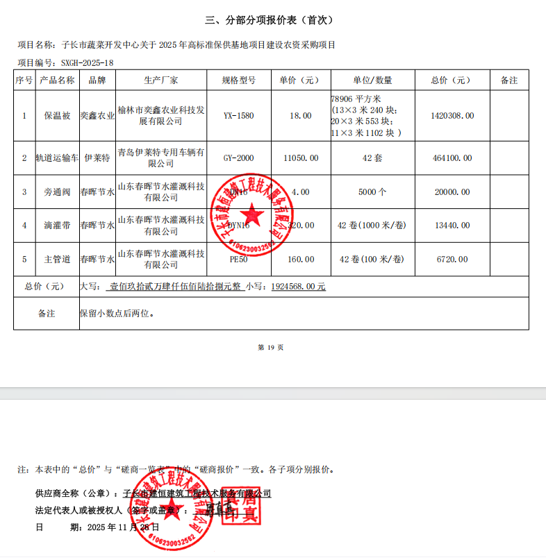 一、项目编号:SXGH-2025-18 二、项目名称:关于2025年高标准保供基地项目建设农资采购项目 三、采购结果 采购包1: | 供应商名称 | 供应商地址 | 中标(成交)金额 | 评审总得分 | | 子长市建恒建筑工程技术服务有限公司 | 子长市农科所 | 1,924,000.00元 | 92.00 | 四、主要标的信息 合同包1(子长市蔬菜开发中心关于2025年高标准保供基地项目建设农资采购项目): 货物类(子长市建恒建筑工程技术服务有限公司) | 品目号 | 品目名称 | 采购标的 | 品牌 | 规格型号 | 数量(单位) | 单价(元) | 总价(元) | | 1 | 其他被服 | 保温被78906平方米,轨道运输车42套,旁通阀5000个,滴灌带42卷(1000米/卷),主管道42卷(100米/卷)。 | 详见附件 | 详见附件 | 1.00(批) | 1,924,000.00 | 1,924,000.00 | 五、评审专家(单一来源采购人员)名单: 六、代理服务收费标准及金额: | 代理服务收费标准及金额 | 参照《国家计委关于印发招标代理服务收费管理暂行办法的通知》(计价格【2002】1980号)和国家发改委办公厅颁发的《关于招标代理服务收费有关问题的通知》(发改办价格【2003】857号)收取。 | | 合同包号 | 合同包名称 | 代理服务费金额(万元) | 收取对象 | | 1 | 子长市蔬菜开发中心关于2025年高标准保供基地项目建设农资采购项目 | 2.5164 | 中标(成交)供应商 | 七、公告期限 自本公告发布之日起1个工作日。 八、其他补充事宜 九、凡对本次公告内容提出询问,请按以下方式联系。 1.采购人信息 名称:子长市蔬菜开发中心 地址:陕西省延安市子长县东关农科院5楼1号 联系方式:13991788996 2.采购代理机构信息 名称:陕西共航项目管理有限公司 地址:延安市宝塔区新城街道上城六号二号楼一单元801室 联系方式:19929819394 3.项目联系方式 项目联系人:杨银萍 电话:19929819394 陕西共航项目管理有限公司 2025年12月01日 |