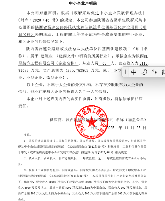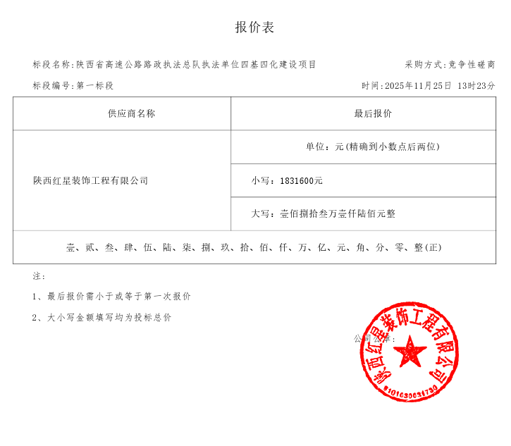 七、公告期限自本公告发布之日起1个工作日。 八、其他补充事宜据财办库〔2023〕243号《关于进一步提高政府采购透明度和采购效率相关事项的通知》公示如下:陕西红星装饰工程有限公司 评审总得分:239.00分;评审平均分:79.67分;最终得分:92.04分。 九、凡对本次公告内容提出询问,请按以下方式联系。1.采购人信息名称:陕西省高速公路路政执法总队 地址:西安市友谊西路352号 联系方式:029-88489982 2.采购代理机构信息名称:陕西省省级单位政府采购中心 地址:西安市碑林区长安北路14号 联系方式:029-88661306 3.项目联系方式项目联系人:李老师 电话:029-88661306 陕西省省级单位政府采购中心 2025年12月01日 相关公告 | ||||||||||||||||||||||||||||||||||||||||||||||||||||||||||||||||||||||||||||||||||||||||||||||||||||||||||||||||||||||||||||