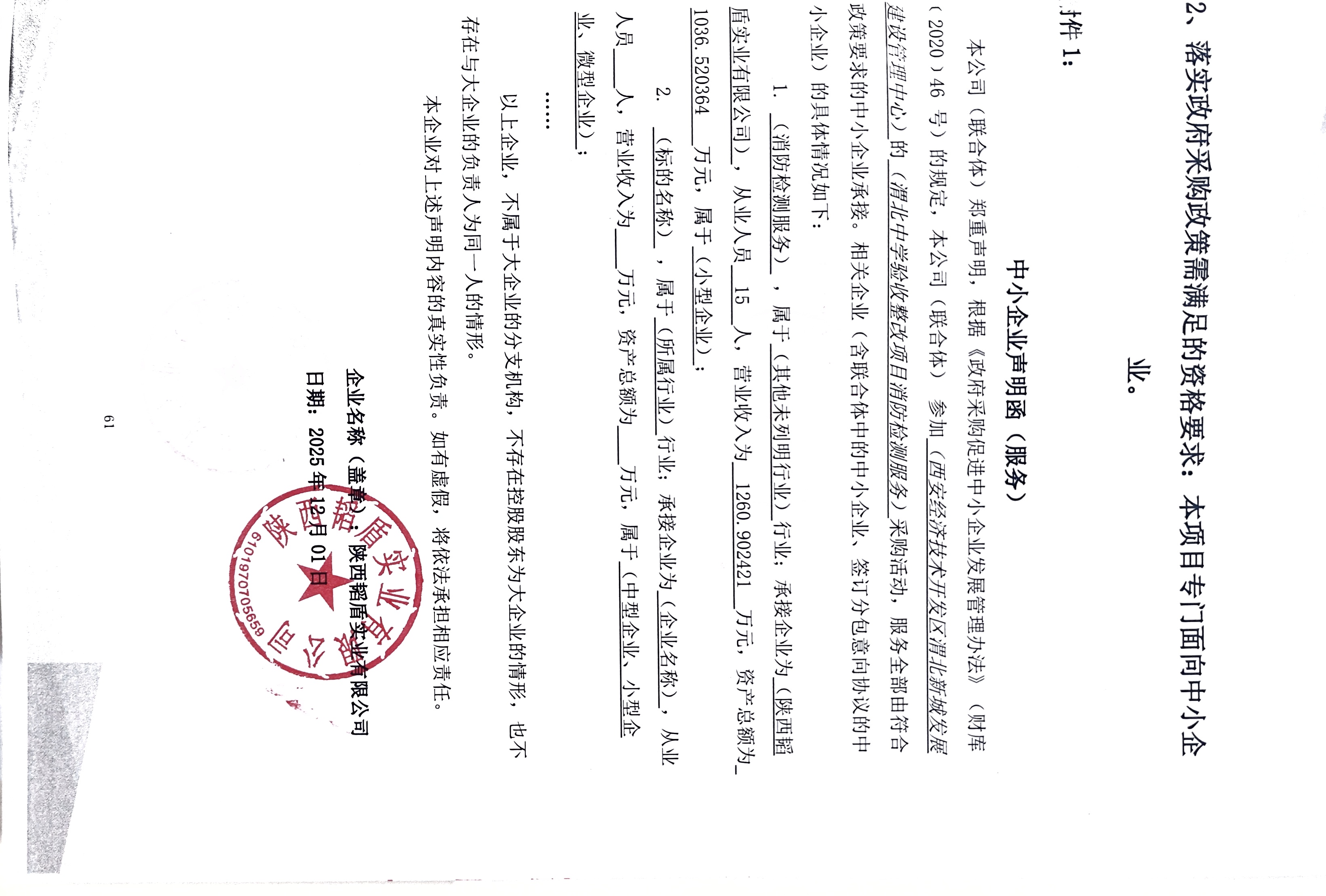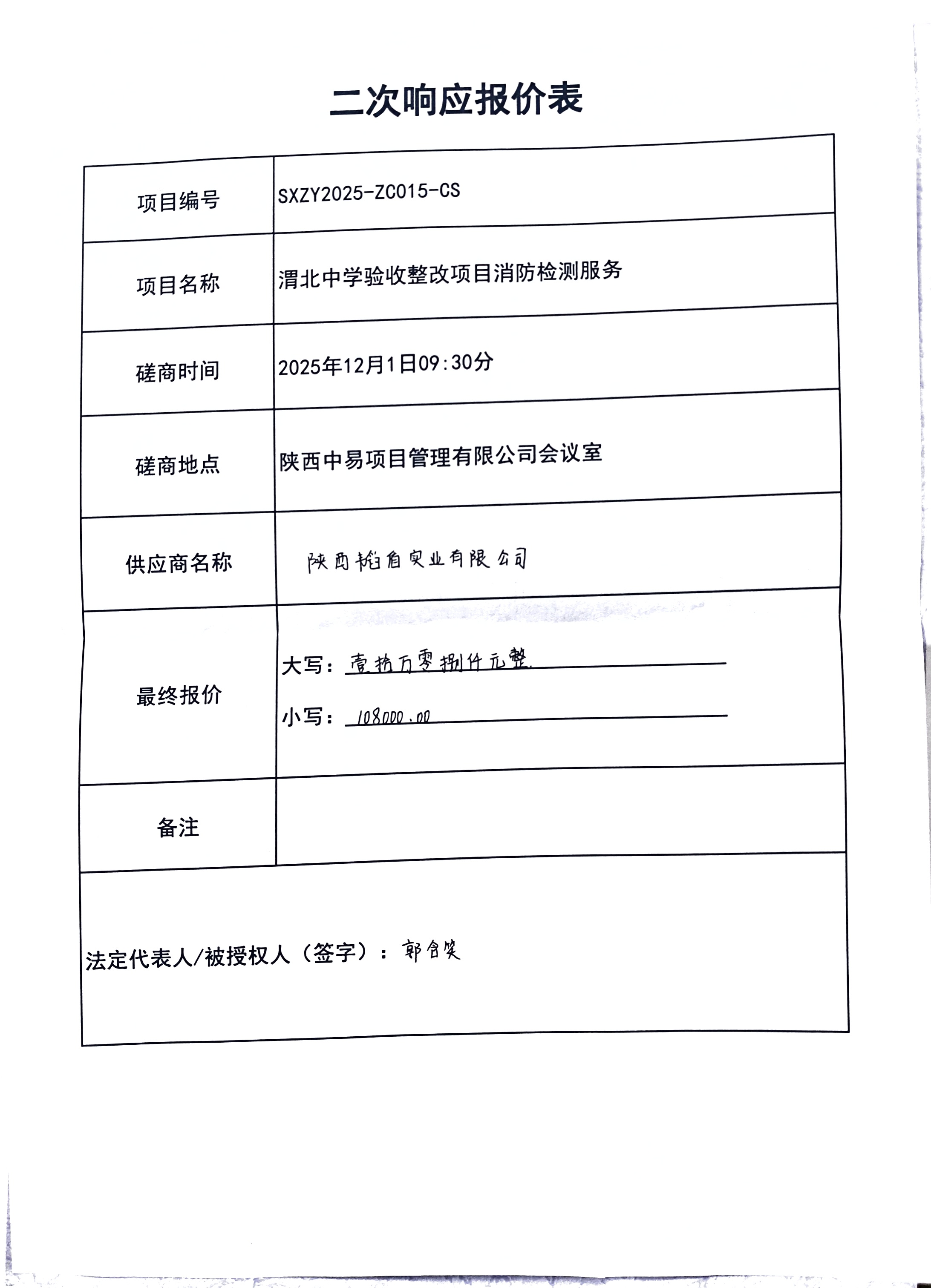 一、项目编号:SXZY2025-ZC015-CS 二、项目名称:渭北中学验收整改项目消防检测服务 三、采购结果 采购包1: | 供应商名称 | 供应商地址 | 中标(成交)金额 | 评审总得分 | | 陕西韬盾实业有限公司 | 陕西省 | 108,000.00元 | 88.67 | 四、主要标的信息 合同包1(渭北中学验收整改项目消防检测服务): 服务类(陕西韬盾实业有限公司) | 品目号 | 品目名称 | 采购标的 | 服务范围 | 服务要求 | 服务时间 | 服务标准 | 金额(元) | | 1 | 其他工程管理服务 | 消防检测服务 | 满足采购需求 | 合格 | 自合同签订之日起至项目结束 | 合格 | 108,000.00 | 五、评审专家(单一来源采购人员)名单: 六、代理服务收费标准及金额: | 代理服务收费标准及金额 | 参照国家计委颁发的《招标代理服务收费管理暂行办法》(计价格〔2002〕1980号)和国家发展改革委员会办公厅颁发的《关于招标代理服务收费有关问题的通知》(发改办价格〔2003〕857号)的文件中服务类收费标准计取。(不足5000元,按照5000元收取) | | 合同包号 | 合同包名称 | 代理服务费金额(万元) | 收取对象 | | 1 | 渭北中学验收整改项目消防检测服务 | 0.5 | 中标(成交)供应商 | 七、公告期限 自本公告发布之日起1个工作日。 八、其他补充事宜 供应商地址:陕西省西安市经济技术开发区凤城一路12号中城大厦8楼801室 九、凡对本次公告内容提出询问,请按以下方式联系。 1.采购人信息 名称:西安经济技术开发区渭北新城发展建设管理中心 地址:西安市临潼区秦王一路渭北商务中心16楼 联系方式:029-83993160 2.采购代理机构信息 名称:陕西中易项目管理有限公司 地址:西安市经开区尚稷路碧桂园文景府1号楼201室 联系方式:029-89291292 3.项目联系方式 项目联系人:吴工 电话:029-89291292 陕西中易项目管理有限公司 2025年12月03日 |