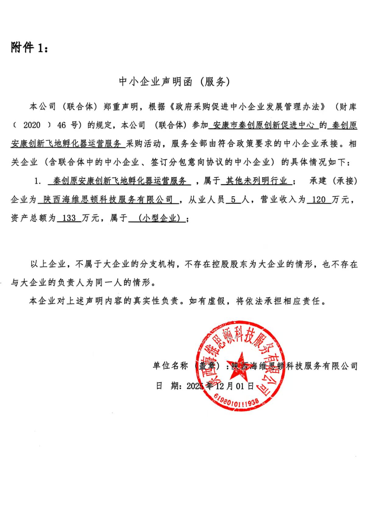 公告概要:| 公告信息: | | 采购项目名称 | 秦创原安康创新飞地孵化器运营服务 | | 品目 | | | 采购单位 | 安康市秦创原创新促进中心 | | 行政区域 | 安康市 | 公告时间 | 2025年12月03日 16:20 | | 评审专家(单一来源采购人员)名单 | 赵省良,樊超,张黎莉 | | 总成交金额 | ¥11.880000 万元(人民币) | | 联系人及联系方式: | | 项目联系人 | 李东英 | | 项目联系电话 | 15114957811 | | 采购单位 | 安康市秦创原创新促进中心 | | 采购单位地址 | 安康高新创业大厦12楼 | | 采购单位联系方式 | 18690552611 | | 代理机构名称 | 陕西力天永信项目管理有限公司 | | 代理机构地址 | 陕西省西安市雁塔区陕西省西安市高新区丈八四路六号缤纷南郡11-1-304 | | 代理机构联系方式 | 15114957811 | | 附件: | | 附件1 | 安康市秦创原创新促进中心秦创原安康创新飞地孵化器运营服务中标(成交)明细.pdf | | 附件2 | 中小企业声明函.jpg | | 附件3 | 秦创原安康创新飞地孵化器运营服务.doc |