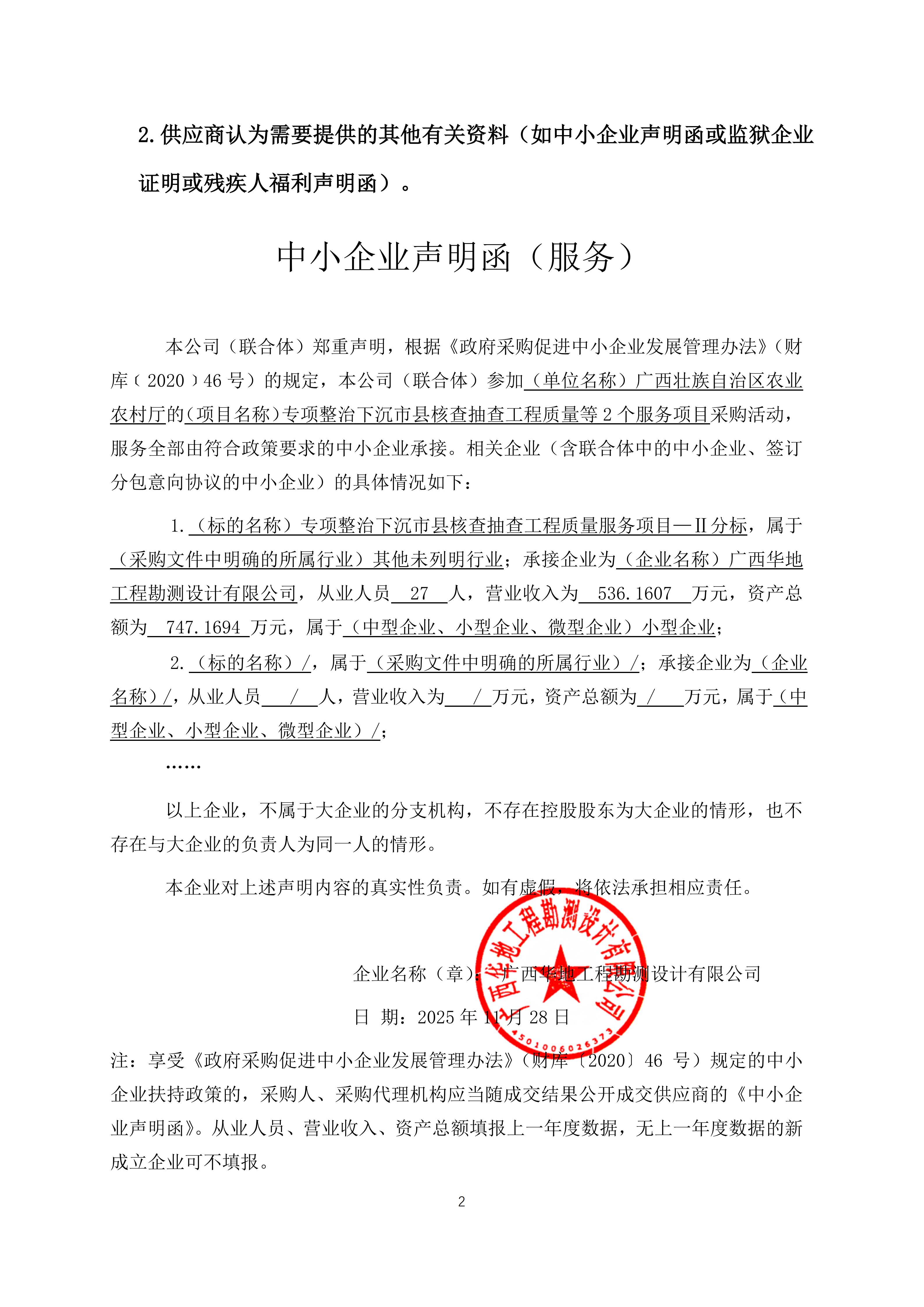 一、项目编号:GXZC2025-C3-003540-JZZB 二、项目名称:专项整治下沉市县核查抽查工程质量等2个服务项目 三、中标(成交)信息 1.中标结果: | 序号 | 中标(成交)金额(元) | 中标供应商名称 | 中标供应商地址 | | 1 | 报价:599500(元) | 恒企工程技术集团有限公司 | 中国(广西)自由贸易试验区南宁片区凯旋路16号广西裕达集团南宁五象总部基地1号办公楼十八层1802、1803、1805号房 | | 2 | 报价:618500(元) | 广西华地工程勘测设计有限公司 | 南宁市青秀区竹溪大道36号青湖中心2202号 | | 3 | 报价:406900(元) | 环创工程科技(广西)有限公司 | 广西壮族自治区南宁市马山县白山镇新村南一里89号 |