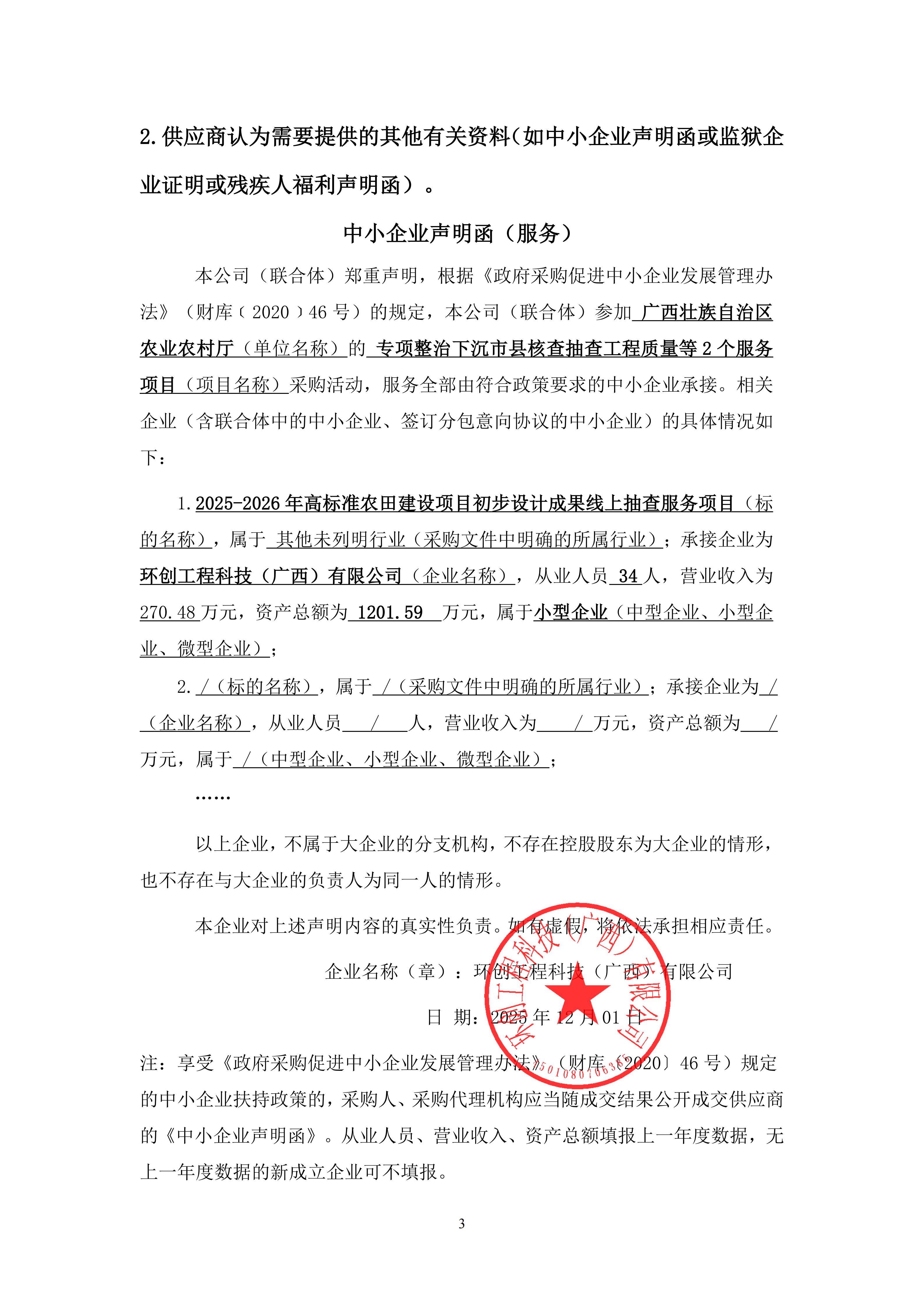 2.废标结果: 四、主要标的信息 服务类主要标的信息: | 序号 | 标项名称 | 标的名称 | 服务范围 | 服务要求 | 服务时间 | 服务标准 | | 1 | 专项整治下沉市县核查抽查工程质量服务项目—Ⅰ分标 | 专项整治下沉市县核查抽查工程质量服务项目—Ⅰ分标 | 具体内容详见竞争性磋商文件。 | 具体内容详见竞争性磋商文件。 | 具体内容详见竞争性磋商文件。 | 具体内容详见竞争性磋商文件。 | | 2 | 专项整治下沉市县核查抽查工程质量服务项目—Ⅱ分标 | 专项整治下沉市县核查抽查工程质量服务项目—Ⅱ分标 | 具体内容详见竞争性磋商文件。 | 具体内容详见竞争性磋商文件。 | 具体内容详见竞争性磋商文件。 | 具体内容详见竞争性磋商文件。 | | 3 | 2025-2026年高标准农田建设项目初步设计成果线上抽查服务项目 | 2025-2026年高标准农田建设项目初步设计成果线上抽查服务项目 | 具体内容详见竞争性磋商文件。 | 具体内容详见竞争性磋商文件。 | 具体内容详见竞争性磋商文件。 | 具体内容详见竞争性磋商文件。 |