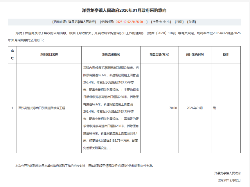 公告概要:| 公告信息: | | 采购项目名称 | 西汉高速龙亭出口引线道路修复整治项目 | | 品目 | | | 采购单位 | 洋县龙亭镇人民政府 | | 行政区域 | 洋县 | 公告时间 | 2025年12月05日 11:30 | | 获取采购文件时间 | 2025年12月05日至2025年12月12日 每日上午:08:00 至 12:00 下午:14:00 至 18:00(北京时间,法定节假日除外) | | 响应文件递交地点 | 陕西柏骁项目管理有限公司五楼会议室(洋县云江月酒店向东30米) | | 响应文件开启时间 | 2025年12月16日 14:30 | | 响应文件开启地点 | 陕西柏骁项目管理有限公司四楼代理部(陕西省汉中市洋县云江月酒店向东30米) | | 预算金额 | ¥70.000000万元(人民币) | | 联系人及联系方式: | | 项目联系人 | 王女士 | | 项目联系电话 | 0916-8211122 | | 采购单位 | 洋县龙亭镇人民政府 | | 采购单位地址 | 陕西省汉中市洋县龙亭镇人民政府 | | 采购单位联系方式 | 0916-8442324 | | 代理机构名称 | 陕西柏骁项目管理有限公司 | | 代理机构地址 | 陕西省汉中市洋县云江月酒店向东30米 | | 代理机构联系方式 | 0916-8211122 | | 附件: | | 附件1 | 西汉高速龙亭出口引线道路修复整治项目采购表.pdf | | 附件2 | 意向公开.png |