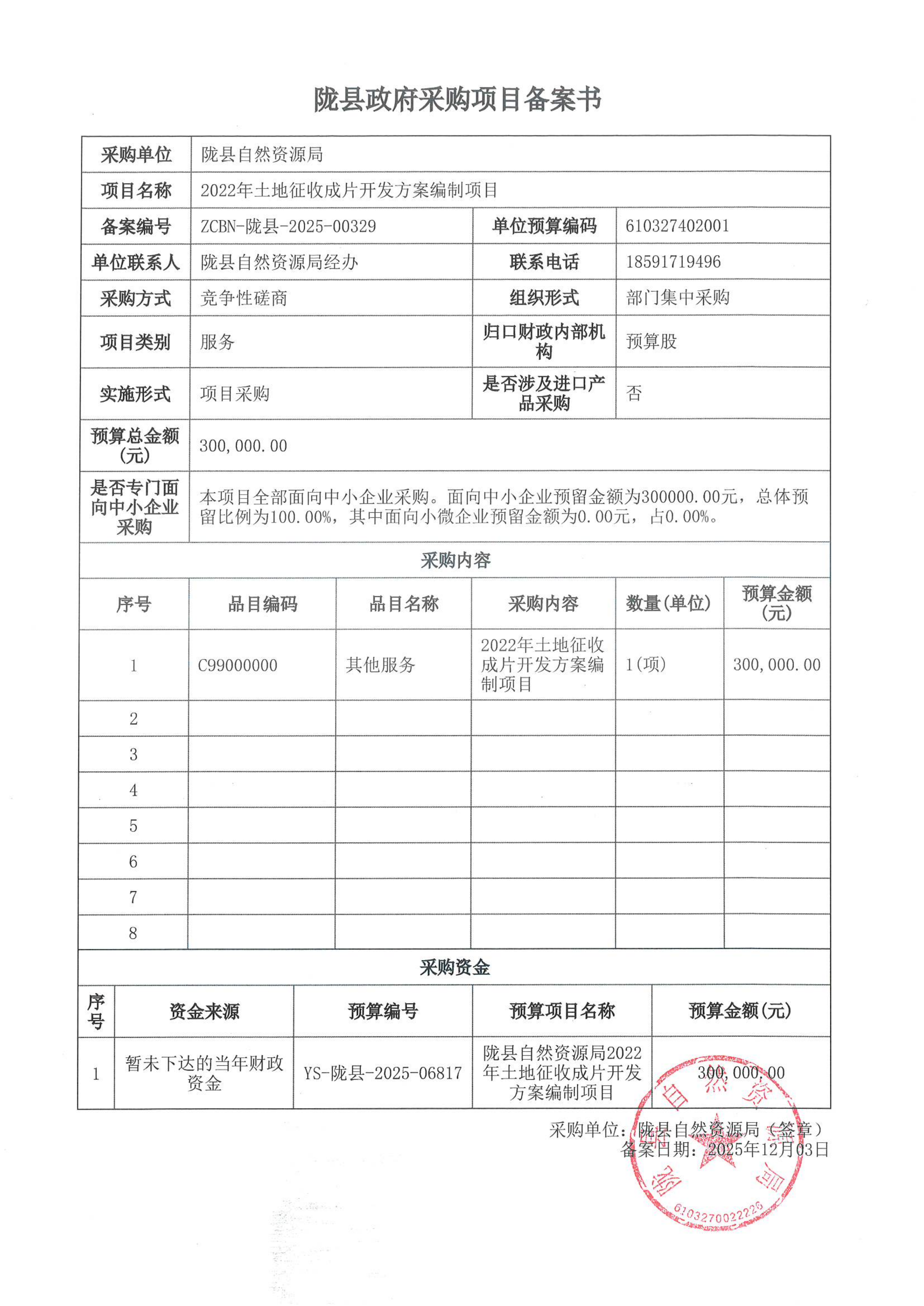 本合同包不接受联合体投标 合同履行期限:以采购文件为准 二、申请人的资格要求:1.满足《中华人民共和国政府采购法》第二十二条规定; 2.落实政府采购政策需满足的资格要求: 合同包1(2022年土地征收成片开发方案编制项目)落实政府采购政策需满足的资格要求如下: (1)《政府采购促进中小企业发展管理办法》(财库〔2020〕46号)、财政部关于进一步加大政府采购支持中小企业力度的通知(财库〔2022〕19号); 3.本项目的特定资格要求: 合同包1(2022年土地征收成片开发方案编制项目)特定资格要求如下: (1)供应商须具有独立承担民事责任能力的法人、其他组织或自然人,提供合格有效的法人或者其他组织的营业执照等证明文件,自然人的身份证明; 三、获取采购文件时间: 2025年12月08日 至 2025年12月12日 ,每天上午 09:00:00 至 12:00:00 ,下午 14:00:00 至 17:00:00 (北京时间) 途径:全国公共资源交易平台(陕西省·宝鸡市) 方式:在线获取 售价: 0元 四、响应文件提交截止时间: 2025年12月19日 14时00分00秒 (北京时间) 地点:全国公共资源交易平台(陕西省·宝鸡市)(不见面开标) 五、开启时间: 2025年12月19日 14时00分00秒 (北京时间) 地点:全国公共资源交易平台(陕西省·宝鸡市)(不见面开标) 六、公告期限自本公告发布之日起3个工作日。 七、其他补充事宜1、请供应商按照陕西省财政厅关于政府采购供应商注册登记有关事项的通知中的要求,通过陕西省政府采购网(http://www.ccgp-shaanxi.gov.cn/)注册登记加入陕西省政府采购供应商库及办理供应商入库申请并及时办理CA数字证书(陕西CA锁); 2、本项目为“全流程电子化”采购模式,实行电子投标方式,各供应商须自行在网上下载磋商文件、交纳磋商保证金,并登录全国公共资源交易平台(陕西省·宝鸡市)(http://ggzy.baoji.gov.cn/)-服务指南-下载专区-下载政府采购电子标书制作工具,按照流程制作电子标书并在规定的响应截止时间前上传电子响应文件; 3、供应商在网上填写的单位信息(单位名称、营业执照相关信息)应与竞争性磋商文件要求及后期上传的电子响应文件中相关信息一致,否则造成资格审查不通过的后果供应商自负; 4、提交响应文件截止时间前,供应商应随时留意【陕西省政府采购网】、【全国公共资源交易平台(陕西省·宝鸡市)】上可能发布的变更公告。若变更公告中明确注明本项目提供有变更文件的,供应商应登录企业端后,从〖项目流程·〉项目管理·〉答疑文件下载〗获取更新后的电子磋商文件(*.SXSCF); 5、提交响应文件的方式:从宝鸡市公共资源交易平台〖首页·〉电子交易平台·〉陕西政府采购交易系统·〉企业端〗登录,登录后切换到〖我的项目〗模块,依次点选〖项目流程·〉项目管理·〉上传响应文件〗上传加密后的电子响应文件(*.SXSTF); 注意事项:本项目采用电子化投标,开标(磋商)结束后中标(成交供应商)单位须在3个工作日内将投标(响应)文件纸质版正本一份、副本二份(按要求签字盖章,含电子版U盘)送到采购代理公司。 八、对本次招标提出询问,请按以下方式联系。1.采购人信息名称:陇县自然资源局 地址:陇县北大街9号 联系方式:18591719496 2.采购代理机构信息名称:中泓泽润工程管理咨询有限公司 地址:陕西省宝鸡市金台区大庆路裕隆大厦605室 联系方式:0917-3533105 3.项目联系方式项目联系人:宝鸡分公司 电话:0917-3533105 中泓泽润工程管理咨询有限公司 2025年12月05日 相关附件: 相关公告 | ||||||||||||||||||||||||||||||||||||||||||||||||||||||||||||||||||||||||||||||||||||||||||||||||