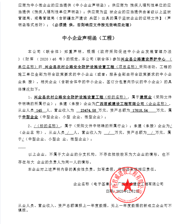一、项目编号:YLZC2025-C2-240115-GXHX 二、项目名称:兴业县农村公路安全防护设施设置工程 三、中标(成交)信息 1.中标结果: | 序号 | 中标(成交)金额(元) | 中标供应商名称 | 中标供应商地址 | | 1 | 报价:603576.33(元) | 广西君威建设工程有限公司 | 城北二路2号城市时代9层06室 |