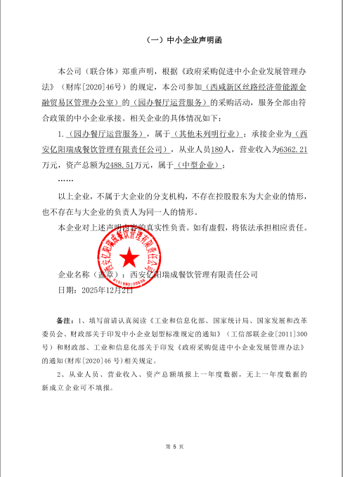 公告概要:| 公告信息: | | 采购项目名称 | 园办餐厅运营服务 | | 品目 | | | 采购单位 | 西咸新区丝路经济带能源金融贸易区管理办公室 | | 行政区域 | 西咸新区(本级) | 公告时间 | 2025年12月05日 19:52 | | 评审专家名单 | 谢惊礼,王佩瑶,惠波,张善文,孔庆玲 | | 总中标金额 | ¥390.816000 万元(人民币) | | 联系人及联系方式: | | 项目联系人 | 樊睿、刘晨星、寻宇超 | | 项目联系电话 | 029-88855325 | | 采购单位 | 西咸新区丝路经济带能源金融贸易区管理办公室 | | 采购单位地址 | 陕西省西咸新区能源金融贸易区金湾大厦A座9层 | | 采购单位联系方式 | 029-33585629 | | 代理机构名称 | 陕西正明项目管理有限公司 | | 代理机构地址 | 陕西省西安市雁塔区科技二路71号竹园天寰国际1807室 | | 代理机构联系方式 | 029-88855325 | | 附件: | | 附件1 | 西咸新区丝路经济带能源金融贸易区管理办公室园办餐厅运营服务中标(成交)明细.pdf | | 附件2 | 餐厅运营中小企业声明函.png | | 附件3 | 【11.11定稿】餐厅运营服务招标文件.pdf |