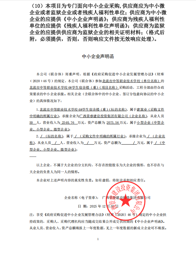 一、项目编号:YLZC2025-C2-810275-ZYJZ 二、项目名称:北流市中等职业技术学校6#学生宿舍楼(重) 三、中标(成交)信息 1.中标结果: | 序号 | 中标(成交)金额(元) | 中标供应商名称 | 中标供应商地址 | | 1 | 报价:3371911.25(元) | 广西景睿建设投资集团有限公司 | 广西壮族自治区玉林市人民东路东216-36号 |