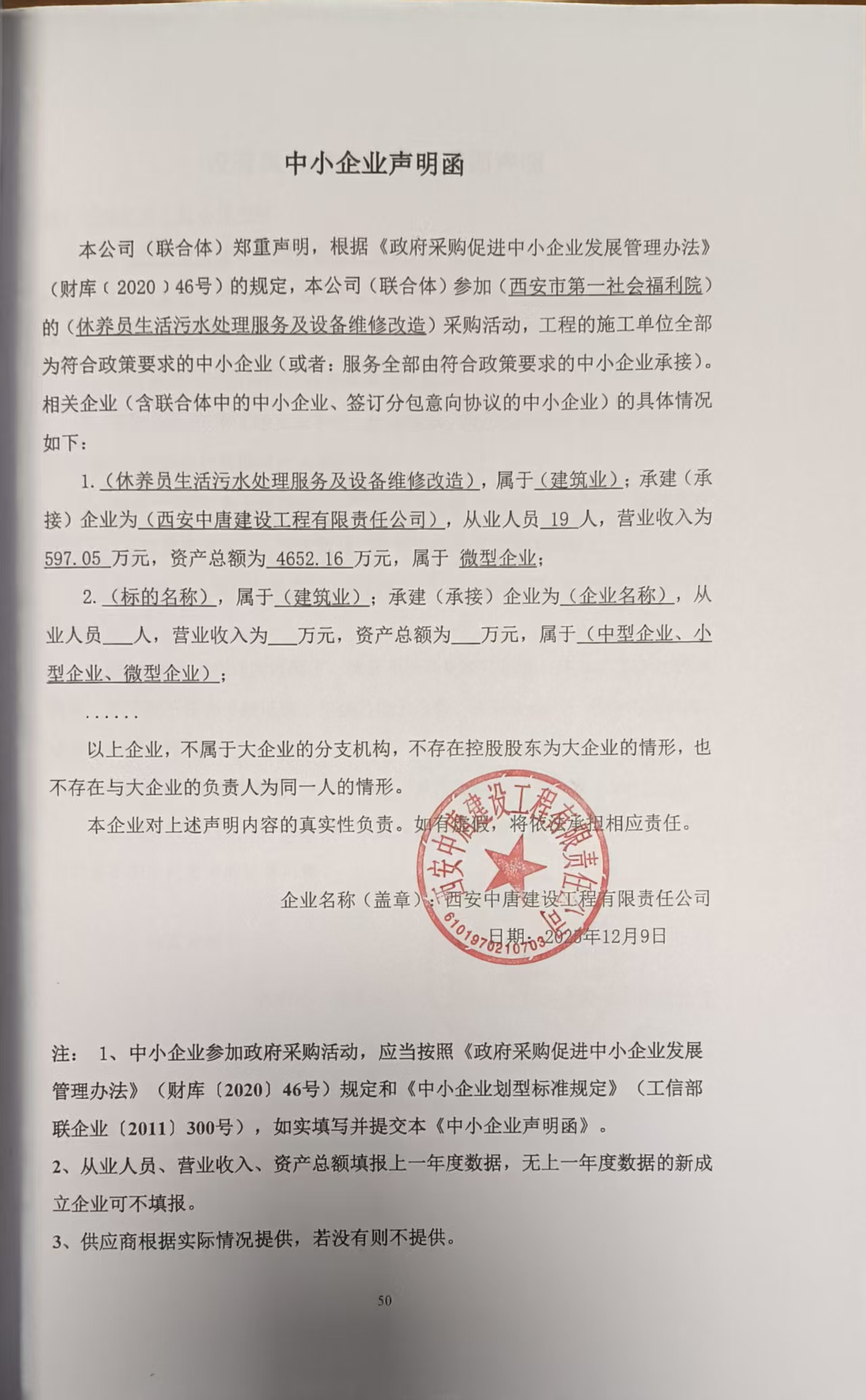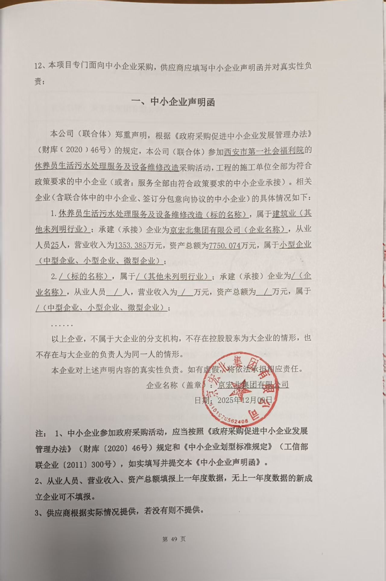 公告概要:| 公告信息: | | 采购项目名称 | 休养员生活污水处理服务及设备维修改造 | | 品目 | | | 采购单位 | 西安市第一社会福利院 | | 行政区域 | 西安市 | 公告时间 | 2025年12月10日 14:38 | | 评审专家(单一来源采购人员)名单 | 刘帅,张力,王亚飞 | | 总成交金额 | ¥77.583000 万元(人民币) | | 联系人及联系方式: | | 项目联系人 | 赵立 | | 项目联系电话 | 029-82493786 | | 采购单位 | 西安市第一社会福利院 | | 采购单位地址 | 西安市长安区五星街道 | | 采购单位联系方式 | 029-82493786 | | 代理机构名称 | 佳奕国际项目管理有限公司 | | 代理机构地址 | 陕西省西安市未央区长和国际D座1601室 | | 代理机构联系方式 | 029-82493786 | | 附件: | | 附件1 | 中唐.jpg | | 附件2 | 智澜.jpg | | 附件3 | 西安市第一社会福利院休养员生活污水处理服务及设备维修改造中标(成交)明细.pdf | | 附件4 | 京宏北.jpg |