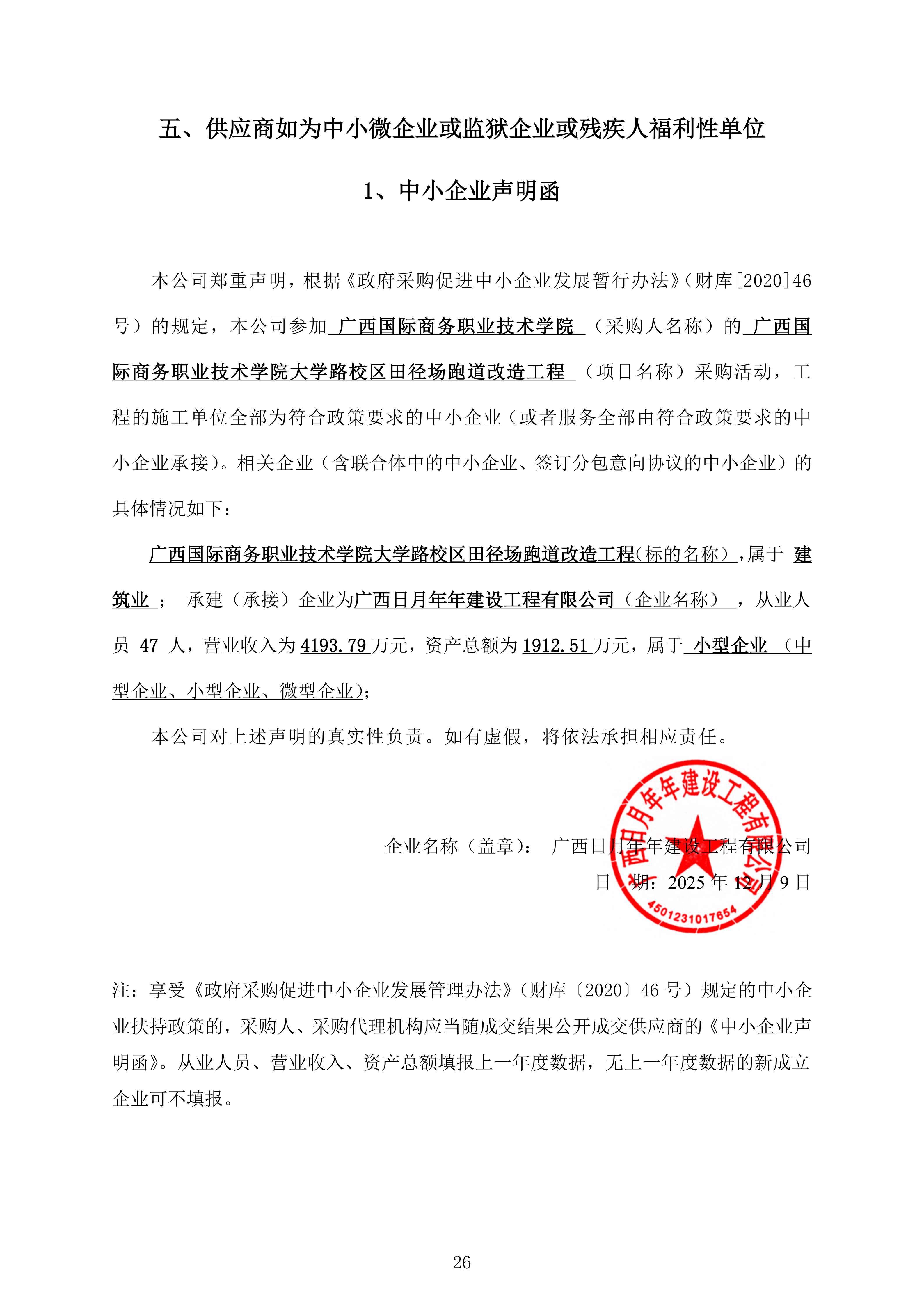 2.废标结果: 四、主要标的信息 工程类主要标的信息: | 序号 | 标项名称 | 标的名称 | 施工范围 | 施工工期 | 项目经理 | 执业证书信息 | | 1 | 广西国际商务职业技术学院大学路校区田径场跑道改造工程 | 广西国际商务职业技术学院大学路校区田径场跑道改造工程 | 具体详见工程量清单及图纸。 | 30天(自合同签订之日起至大学路校区田径场跑道改造工程通过正式验收之日止)。 | 周海南 | 二级注册建造师(注册编号:桂245141544118 | 五、评审专家(单一来源采购人员)名单: 瞿兴文,冯婧(第1分标采购人代表),伍明标 六、代理服务收费标准及金额: 1.代理服务收费标准:以成交金额为计费额,按本磋商文件之《供应商须知正文》第39.3条规定的收费计算标准服务类采用差额定率累进法计算出收费基准价格,采购代理服务费收费以收费基准价格收取。本项目招标代理服务费不达陆仟元整(¥6000.00元)的,按陆仟元整(¥6000.00元)计算。 2.代理服务收费金额(元):12100 七、公告期限 自本公告发布之日起1个工作日。 八、其他补充事宜 1.本项目成交结果公告在中国政府采购网(http://www.ccgp.gov.cn)、广西壮族自治区政府采购网(http://www.gxzfcg.gov.cn)、广西招标网(http://www.guangxibid.com.cn/)。 2.广西日月年年建设工程有限公司评审总得分89.50。 3.成交供应商为小型企业,评审价为1040085.576元。 九、对本次公告内容提出询问,请按以下方式联系 1.采购人信息 名 称:广西国际商务职业技术学院 地 址:广西南宁市大学东路168号 联系方式:0771-3224391 2.采购代理机构信息 名 称:广西建设工程机电设备招标中心有限公司 地 址:广西壮族自治区南宁市青秀区枫林路18号广西国控大厦裙楼三层 联系方式:0771-2821389 3.项目联系方式 项目联系人:谭琦辉、刘雅婷 电 话:0771-2821389 附件信息: |
