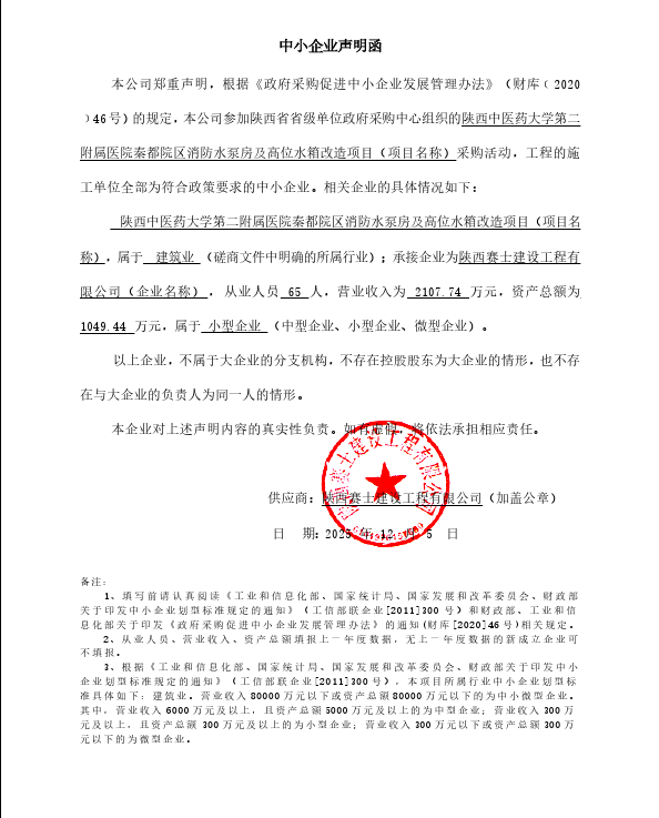 四、主要标的信息合同包1(陕西中医药大学第二附属医院秦都院区消防水泵房及高位水箱改造项目): 工程类(陕西赛士建设工程有限公司)