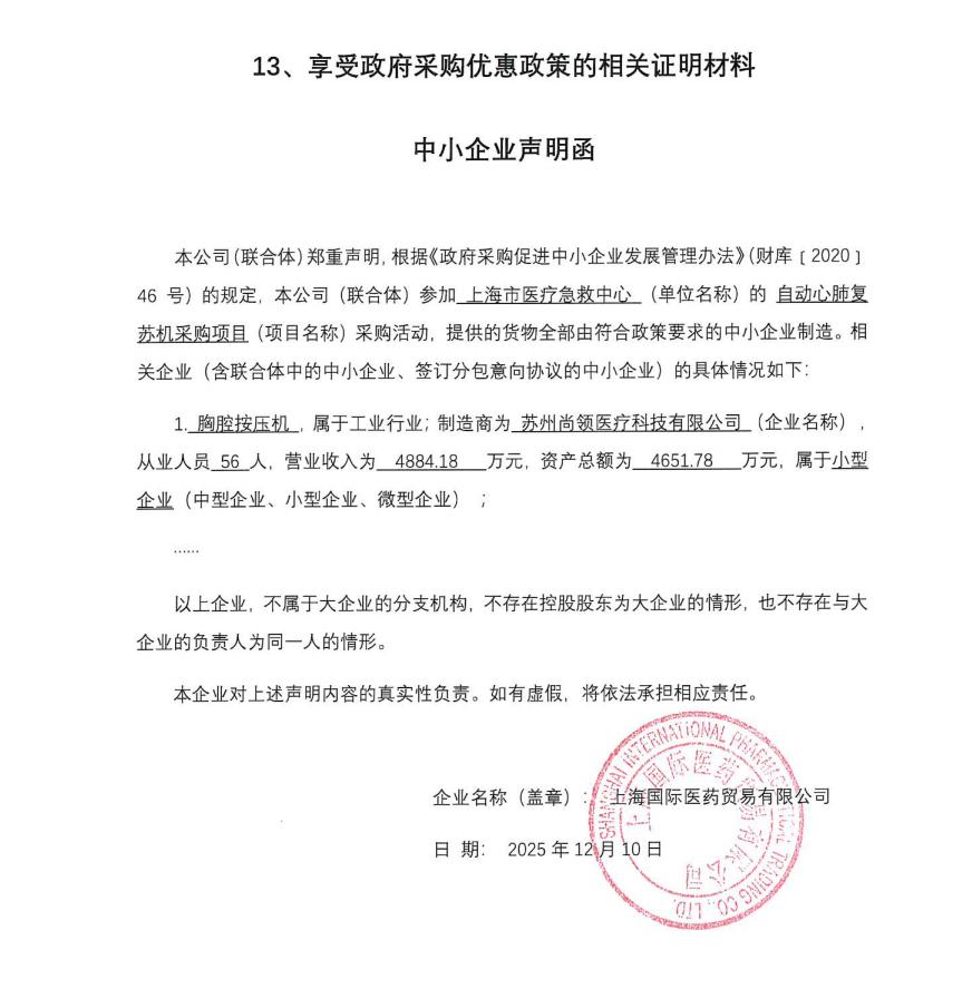 一、项目编号:310000000250624119107-00286548 二、项目名称:自动心肺复苏机 三、中标(成交)信息 | 序号 | 标项名称 | 中标供应商名称 | 中标供应商地址 | 评审总得分 | 中标(成交金额) | 备注 | | 1 | 自动心肺复苏机 | 上海国际医药贸易有限公司 | 上海上海市徐汇区吴中路39号新概念大厦1楼E座 | 92.8 | 3052000.00元 | 无 | 四、主要标的信息 | 序号 | 包名称 | 标的名称 | 品牌 | 规格型号 | 数量 | 单价 | | 1 | 自动心肺复苏机 | 自动心肺复苏机 | 苏州尚领(Sunlife) | MCC-E5 | 28 | 109000.00 | 五、评审专家(单一来源采购人员)名单: 徐鸣跃,赵凯,李涛,周丽华,刘华 六、代理服务收费标准及金额: 1.代理服务收费标准:无 2.代理服务收费金额(元):0.0 七、公告期限 自本公告发布之日起1个工作日。 八、其他补充事宜 推荐理由: 中标(成交供应商)的评审总得分为:92.8 中标人推荐理由:推荐上海国际医药贸易有限公司:你方的投标文件 各项技术指标满足要求,质保年限较长,售后服务故障解决方案较好,综合得分最高,推荐为第一中标候选人。中标供应商中小企业声明函见附件。 九、凡对本次公告内容提出询问,请按以下方式联系 1.采购人信息 名 称:上海市医疗急救中心 地 址:宜山路638号 联系方式:021-24027733 2.采购代理机构信息 名 称:上海市政府采购中心 地 址:上海市大连路515号 联系方式:35968063 3.项目联系方式 项目联系人:张敏捷 电 话:35968063 附件信息: |