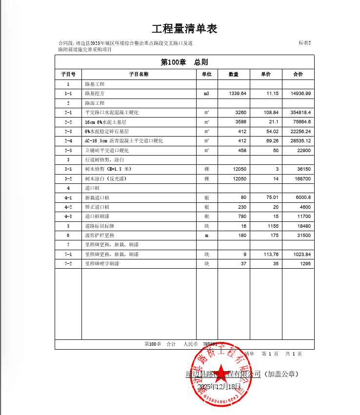 四、主要标的信息合同包1(靖边县2025年城区环境综合整治重点路段交叉路口及道路附属设施完善采购项目): 工程类(靖边县路桥工程有限公司)