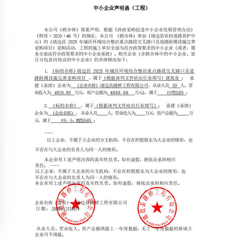 七、公告期限自本公告发布之日起1个工作日。 八、其他补充事宜无。 九、凡对本次公告内容提出询问,请按以下方式联系。1.采购人信息名称:靖边县农村道路养护中心 地址:靖边县东关街46号 联系方式:18220261341 2.采购代理机构信息名称:靖边县县级政府采购中心 地址:陕西省榆林市靖边县靖边县统万路120号 联系方式:0912-4636977 转 8002 3.项目联系方式项目联系人:石宇彦、李春雨 电话:18220261341 、0912-4636977 转 8002 靖边县县级政府采购中心 2025年12月19日 相关公告 | ||||||||||||||||||||||||||||||||||||||||||||||||||||||||||||||||||||||||||||||||||||||||||||||||||||||||||||||||||||||||