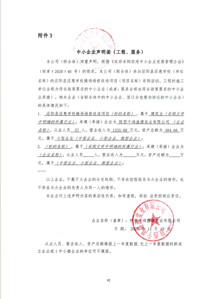 公告概要:| 公告信息: | | 采购项目名称 | 操场维修改造项目 | | 品目 | | | 采购单位 | 泾阳县泾惠学校 | | 行政区域 | 泾阳县 | 公告时间 | 2025年12月22日 11:07 | | 评审专家(单一来源采购人员)名单 | 林禹,艾兵,张沱 | | 总成交金额 | ¥35.704900 万元(人民币) | | 联系人及联系方式: | | 项目联系人 | 陈工 | | 项目联系电话 | 18629680917 | | 采购单位 | 泾阳县泾惠学校 | | 采购单位地址 | 陕西省咸阳市泾阳县夏村东窑组 | | 采购单位联系方式 | 18182519958 | | 代理机构名称 | 众合国际项目管理有限公司 | | 代理机构地址 | 陕西省西安市莲湖区丰登南路3号1幢306室(丰庆公园北门往西200米PM中心三楼306) | | 代理机构联系方式 | 18629680917 | | 附件: | | 附件1 | 泾阳县泾惠学校操场维修改造项目中标(成交)明细.pdf | | 附件2 | 中小企业声明函.png | | 附件3 | 报价表.jpg | | 附件4 | 【定稿磋商文件】泾阳县泾惠学校操场维修改造项目.pdf |