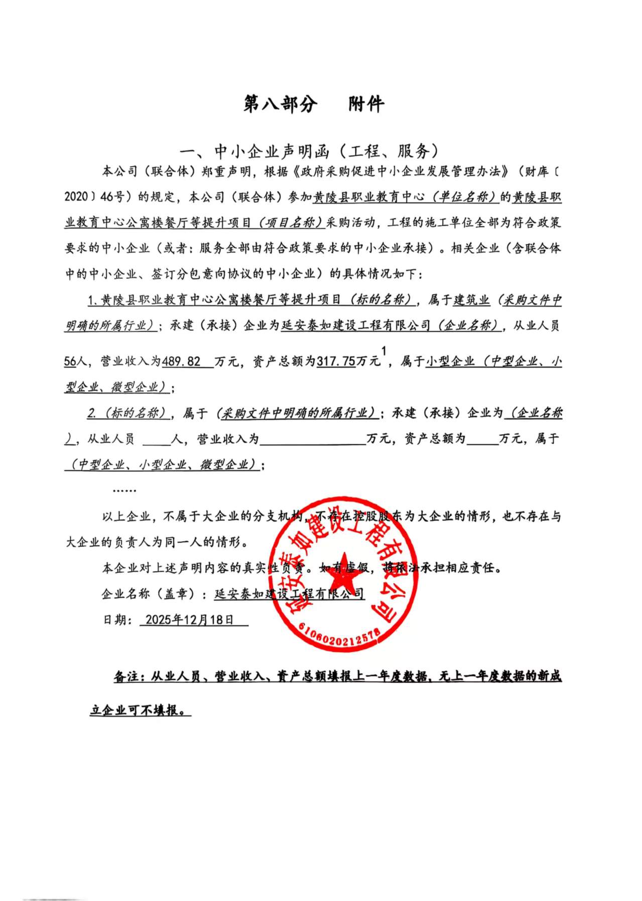 公告概要:| 公告信息: | | 采购项目名称 | 公寓楼餐厅等提升项目 | | 品目 | | | 采购单位 | 黄陵县职业教育中心 | | 行政区域 | 黄陵县 | 公告时间 | 2025年12月22日 09:53 | | 评审专家(单一来源采购人员)名单 | 贾卫东,张清宏,郭小燕 | | 总成交金额 | ¥121.538100 万元(人民币) | | 联系人及联系方式: | | 项目联系人 | 刘翠花、张耀峰、屈小军 | | 项目联系电话 | 15596190006 | | 采购单位 | 黄陵县职业教育中心 | | 采购单位地址 | 黄陵县桥山街道办康崖底村 | | 采购单位联系方式 | 15891573570 | | 代理机构名称 | 亿诚建设项目管理有限公司 | | 代理机构地址 | 陕西省西安市雁塔区陕西省西安市高新区丈八五路高科尚都ONE尚城A座10F | | 代理机构联系方式 | 0911-2812252 | | 附件: | | 附件1 | 公寓楼餐厅等提升项目谈判文件(2025121501).zip | | 附件2 | 黄陵县职业教育中心公寓楼餐厅等提升项目中标(成交)明细.pdf | | 附件3 | 中小企业声明函.jpg |