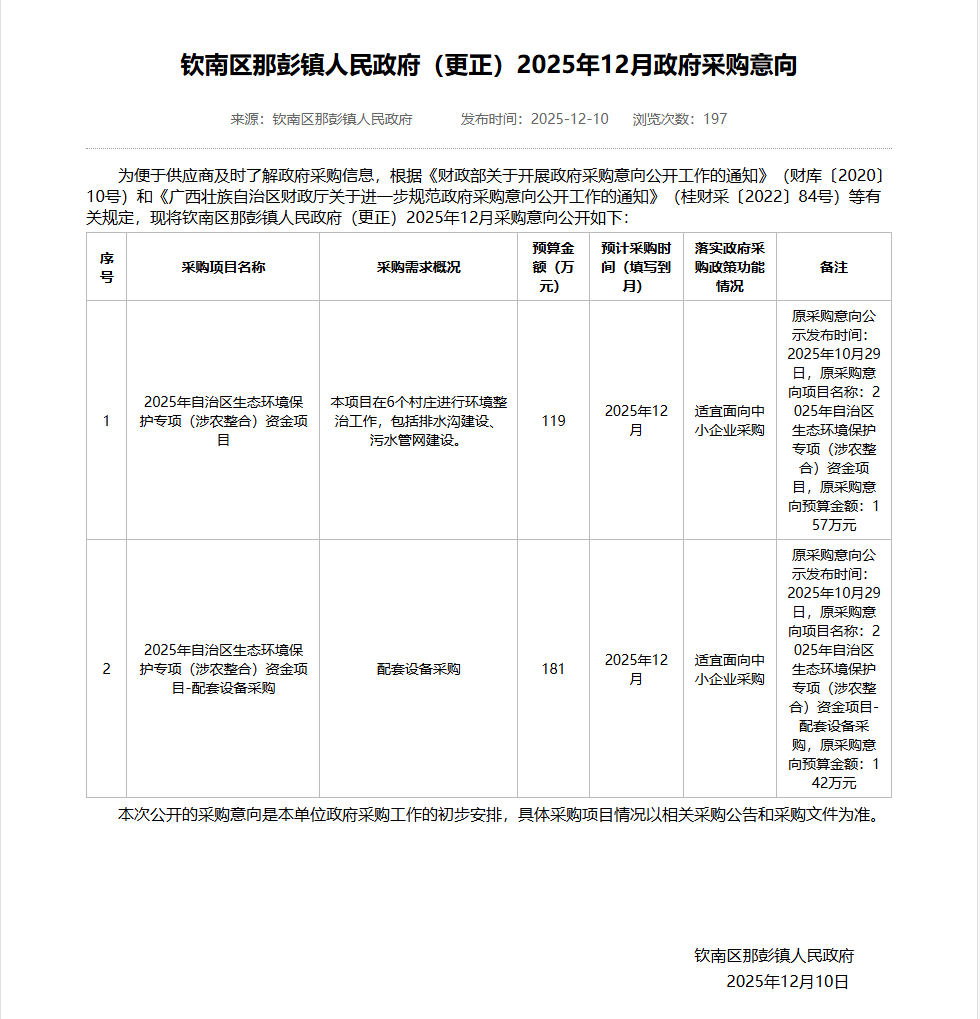 公告概要:| 公告信息: | | 采购项目名称 | 2025年自治区生态环境保护专项(涉农整合)资金项目-配套设备采购 | | 品目 | | | 采购单位 | 钦南区那彭镇人民政府 | | 行政区域 | 广西壮族自治区 | 公告时间 | 2025年12月22日 17:50 | | 获取采购文件的地点 | 广西政府采购云平台(https://www.gcy.zfcg.gxzf.gov.cn/) | | 获取采购文件时间 | 详见公告正文 | | 预算金额 | ¥190.000000万元(人民币) | | 联系人及联系方式: | | 项目联系人 | 徐嘉婕 | | 项目联系电话 | 0777-5682186 | | 采购单位 | 钦南区那彭镇人民政府 | | 采购单位地址 | 钦州市钦南区那彭镇彭兴路220号 | | 采购单位联系方式 | 0777-3781302 | | 代理机构名称 | 广西锐达工程咨询有限公司 | | 代理机构地址 | 钦州市泥桥物流市场旁2栋四楼 | | 代理机构联系方式 | 0777-5682186 |