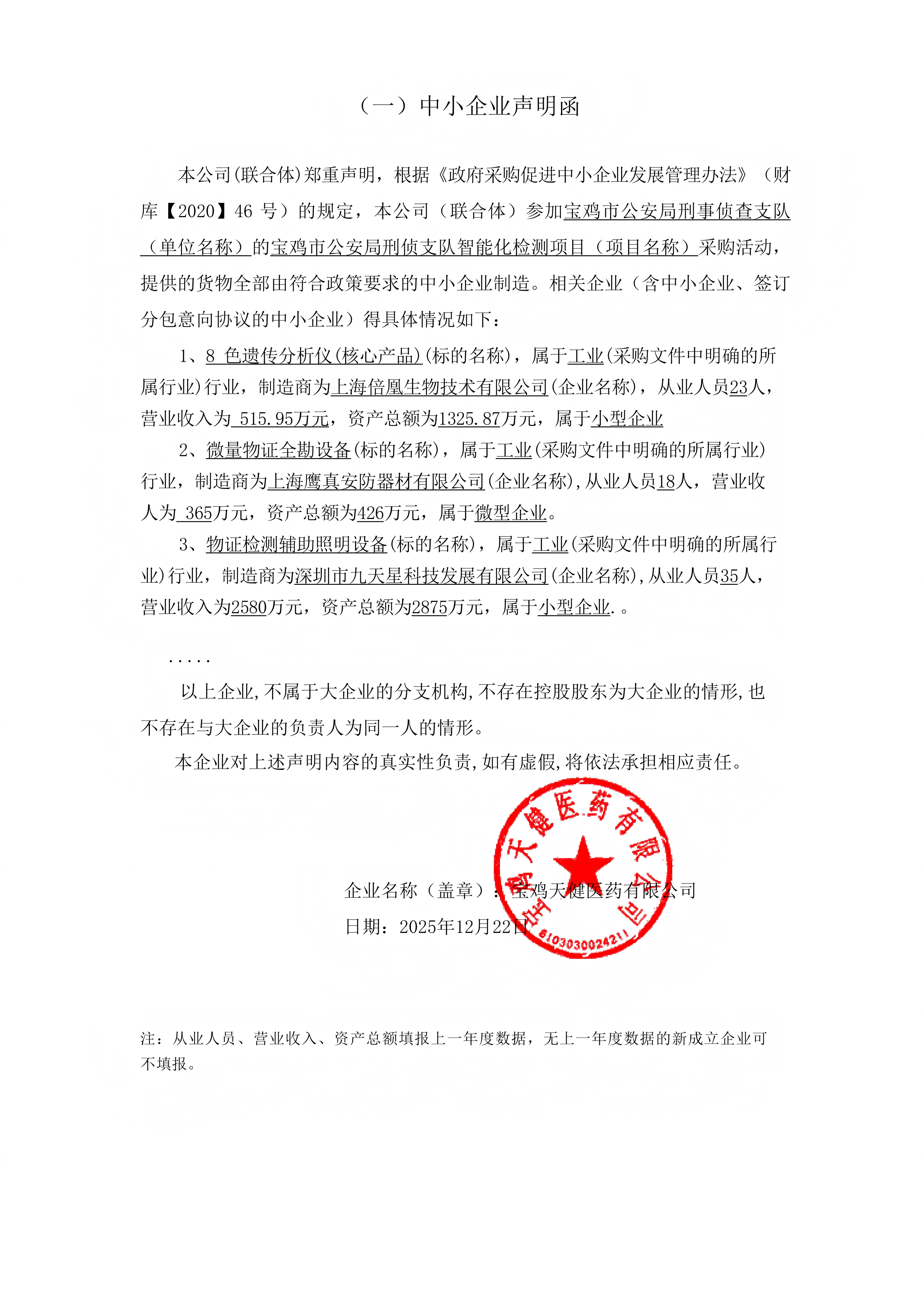 一、项目编号:HJLCG【2025】-0926 二、项目名称:宝鸡市公安局刑侦支队智能化检测项目 三、采购结果 采购包1: | 供应商名称 | 供应商地址 | 中标(成交)金额 | 评审总得分 | | 宝鸡天健医药有限公司 | 陕西省宝鸡市金台区宝十路24号 | 3,689,000.00元 | 86.85 | 四、主要标的信息 合同包1(宝鸡市公安局刑事支队智能化检测项目): 货物类(宝鸡天健医药有限公司) | 品目号 | 品目名称 | 采购标的 | 品牌 | 规格型号 | 数量(单位) | 单价(元) | 总价(元) | | 1 | 其他仪器仪表 | 宝鸡市公安局智能化检测项目设备 | 核心产品:上海倍凰 | 核心产品:ZX1024 | 1.00(套) | 3,689,000.00 | 3,689,000.00 | 五、评审专家(单一来源采购人员)名单: 六、代理服务收费标准及金额: | 代理服务收费标准及金额 | 参照《国家计委关于印发<招标代理服务收费管理暂行办法>的通知》(计价格〔2002〕1980号)、国家发展和改革委员会办公厅颁发的《关于招标代理服务收费有关问题的通知》(发改办价格〔2003〕857号) | | 合同包号 | 合同包名称 | 代理服务费金额(万元) | 收取对象 | | 1 | 宝鸡市公安局刑事支队智能化检测项目 | 4.4579 | 中标(成交)供应商 | 七、公告期限 自本公告发布之日起1个工作日。 八、其他补充事宜 九、凡对本次公告内容提出询问,请按以下方式联系。 1.采购人信息 名称:宝鸡市公安局刑事侦查支队 地址:宝鸡市行政中心4号楼 联系方式:0917-3268111 2.采购代理机构信息 名称:华建联项目管理有限公司 地址:宝鸡市渭滨区高新五路 联系方式:13571722731 3.项目联系方式 项目联系人:周蕾 电话:13571722731 华建联项目管理有限公司 2025年12月23日 |