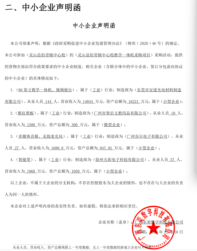 2.废标结果: 四、主要标的信息 货物类主要标的信息: | 序号 | 标项名称 | 标的名称 | 品牌 | 规格型号 | 数量 | 单价(元) | | 1 | 灵山县伯劳镇中心校教学一体机采购项目 | 86 英寸教学一体机 | Amdox | AME- S30HF | 23 套 | 11270 | | 2 | 灵山县伯劳镇中心校教学一体机采购项目 | 视频展台 | Amdox | AME- GPYB1-A | 23 个 | 800 | | 3 | 灵山县伯劳镇中心校教学一体机采购项目 | 推拉黑板 | 智启 | ZQ-4013 | 23 个 | 700 | | 4 | 灵山县伯劳镇中心校教学一体机采购项目 | 多媒体音箱 | 谷尔 | G-920A | 23 个 | 500 | | 5 | 灵山县伯劳镇中心校教学一体机采购项目 | 无线麦克风 | 谷尔 | D40108 | 23 个 | 300 | | 6 | 灵山县伯劳镇中心校教学一体机采购项目 | 智能笔 | skycolor | P201 | 23 支 | 150 | 五、评审专家(单一来源采购人员)名单: 沈文晓,龙沼,陈海锋(第1分标采购人代表) 六、代理服务收费标准及金额: 1.代理服务收费标准:按钦州市物价局“钦市价费﹝2013﹞4号”文件,以差额定率累进法计算。成交供应商须按成交金额缴纳相应的代理服务费。 2.代理服务收费金额(元):3786.72 七、公告期限 自本公告发布之日起1个工作日。 八、其他补充事宜 无 九、对本次公告内容提出询问,请按以下方式联系 1.采购人信息 名 称:灵山县伯劳镇中心校 地 址:广西钦州市灵山县伯劳镇中心校 联系方式:0777-6251017 2.采购代理机构信息 名 称:钦州市政府采购中心 地 址:钦州市金海湾东大街8号市政务服务中心 联系方式:0777-2886006 3.项目联系方式 项目联系人:莫丹丹 电 话:0777-2886006 附件信息: |