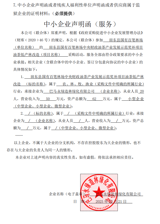 公告概要:| 公告信息: | | 采购项目名称 | 田东县国有百笔林场中央财政油茶产业发展示范奖补项目油茶低产林改造 | | 品目 | | | 采购单位 | 田东县国有百笔林场 | | 行政区域 | 广西壮族自治区 | 公告时间 | 2025年12月25日 15:44 | | 评审专家(单一来源采购人员)名单 | 林植伟(第1分标采购人代表),施忠胄,雷英芳 | | 总成交金额 | ¥121.690000 万元(人民币) | | 联系人及联系方式: | | 项目联系人 | 莫艳青 | | 项目联系电话 | 0776-2808858 | | 采购单位 | 田东县国有百笔林场 | | 采购单位地址 | 田东县思林镇内油村百笔林场 | | 采购单位联系方式 | 19178638850 | | 代理机构名称 | 广西念宇建设项目管理有限公司 | | 代理机构地址 | 百色市右江区前程路4号长乐星城写字楼4楼 | | 代理机构联系方式 | 0776-2808858 |