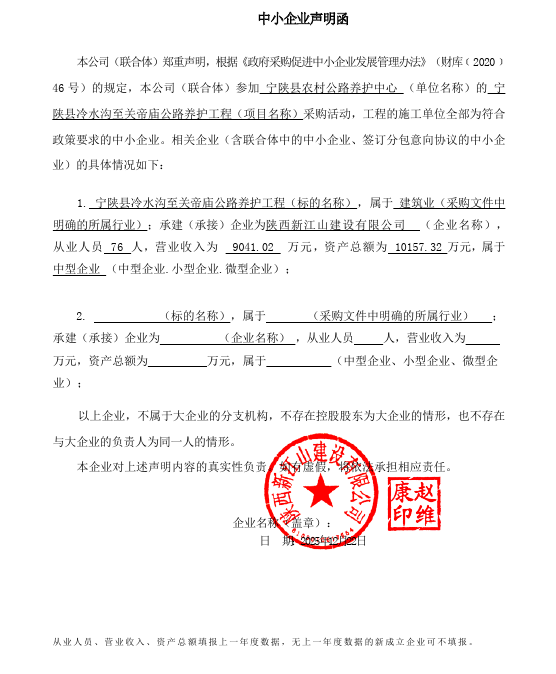 四、主要标的信息合同包1(宁陕县冷水沟至关帝庙公路养护工程): 工程类(陕西新江山建设有限公司)