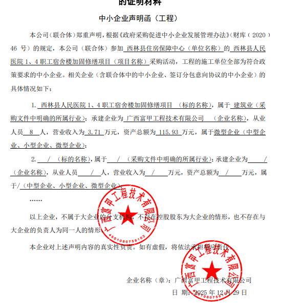 2.废标结果: 四、主要标的信息 工程类主要标的信息: | 序号 | 标项名称 | 标的名称 | 施工范围 | 施工工期 | 项目经理 | 执业证书信息 | | 1 | 西林县人民医院1、4职工宿舍楼加固修缮项目 | 西林县人民医院1、4职工宿舍楼加固修缮项目 | 由于西林县人民医院1、4职工宿舍楼已鉴定为C级危房,存在安全隐患,根据整改要求,需要对这两幢楼共32套约2100平方的住宅进行维修加固,主要对存在安全隐患的构件等进行加固、增建梁柱等承重建筑,达到居住使用的安全标准。(具体内容及各项技术指标以项目施工图纸及工程量清单为准)。 | 90日历天。 | 潘小未 | 桂245171866616 | 五、评审专家(单一来源采购人员)名单: 崔琼芳(第1分标采购人代表),刘致宁,贝念新 六、代理服务收费标准及金额: 1.代理服务收费标准: 按照国家发展计划委员会计价格[2002]1980号《招标代理服务费管理暂行办法》、《国家发展改革委办公厅关于招标代理服务费的通知》(发改办价格[2003]857号)和《国家发展改革委关于降低部分建设项目收费标准规范收费行为等有关问题的通知》国家发改【2015】299)计取。由中标方(成交方)向招标代理机构一次性付清。 2.代理服务收费金额(元):14891 七、公告期限 自本公告发布之日起1个工作日。 八、其他补充事宜 1、供应商认为成交结果使自己的权益受到损害的,可以自成交公告期限届满之日起七个工作日内以书面形式向广西景烨工程咨询有限公司提出质疑,逾期将不再受理。 2.发布公告的媒介:中国政府采购网、广西壮族自治区政府采购网。 九、对本次公告内容提出询问,请按以下方式联系 1.采购人信息 名 称:西林县住房保障中心 地 址:西林县八达镇城北街010号 联系方式:0776-8682313 2.采购代理机构信息 名 称:广西景烨工程咨询有限公司 地 址:广西壮族自治区百色市右江区迎龙路66号幸福东郡第8幢1单元2层207-210号 联系方式:0776-3518527 3.项目联系方式 项目联系人:黄秋雨 电 话:0776-3518527 附件信息: |