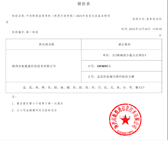 公告概要:| 公告信息: | | 采购项目名称 | 2025年信息化设备采购项目 | | 品目 | | | 采购单位 | 中共陕西省委党校 | | 行政区域 | 陕西省 | 公告时间 | 2025年12月29日 11:10 | | 评审专家(单一来源采购人员)名单 | 曹皓,卫霞,王新勇 | | 总成交金额 | ¥198.460000 万元(人民币) | | 联系人及联系方式: | | 项目联系人 | 杨老师 | | 项目联系电话 | 029-88661306 | | 采购单位 | 中共陕西省委党校 | | 采购单位地址 | 西安市雁塔区小寨西路119号 | | 采购单位联系方式 | 029-85378239 | | 代理机构名称 | 陕西省省级单位政府采购中心 | | 代理机构地址 | 西安市碑林区长安北路14号 | | 代理机构联系方式 | 029-88661361 | | 附件: | | 附件1 | 陕西启航分项报价表(二次).pdf | | 附件2 | 中共陕西省委党校2025年信息化设备采购项目中标(成交)明细.pdf | | 附件3 | 最终报价表.png |
