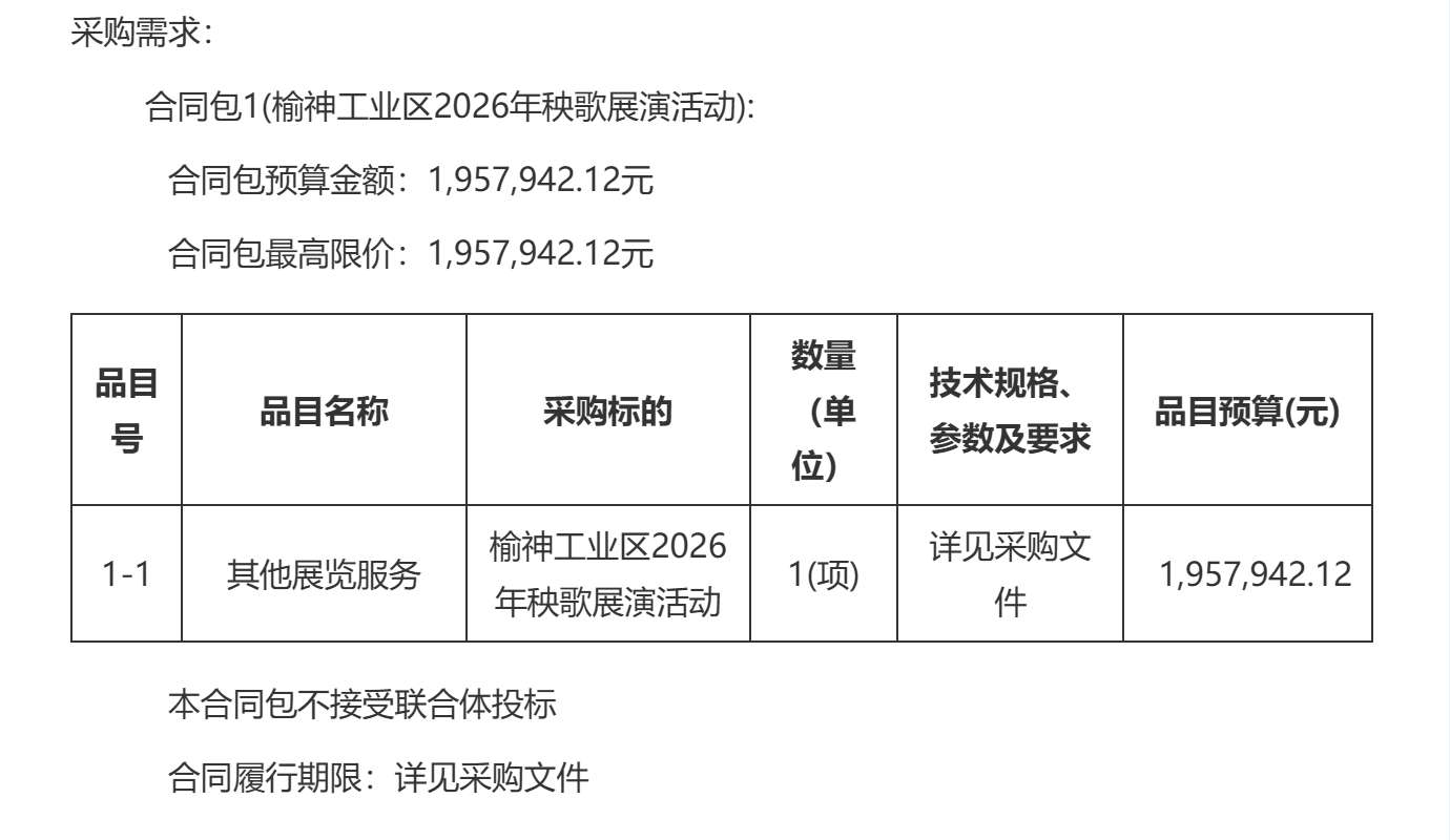 公告概要:| 公告信息: | | 采购项目名称 | 榆神工业区2026年秧歌展演活动 | | 品目 | | | 采购单位 | 榆神工业区管理委员会 | | 行政区域 | 榆神工业区 | 公告时间 | 2026年01月04日 14:46 | | 获取采购文件时间 | 2026年01月05日至2026年01月09日 每日上午:08:00 至 12:00 下午:12:00 至 18:00(北京时间,法定节假日除外) | | 响应文件递交地点 | 全国公共资源交易平台(陕西省)网站【首页〉电子交易平台〉线上递交 | | 响应文件开启时间 | 2026年01月16日 09:30 | | 响应文件开启地点 | 全国公共资源交易平台(陕西省)网站【首页〉电子交易平台〉线上下载 | | 预算金额 | ¥195.794212万元(人民币) | | 联系人及联系方式: | | 项目联系人 | 榆林榆呼百达工程项目管理有限公司 | | 项目联系电话 | 15319657596 | | 采购单位 | 榆神工业区管理委员会 | | 采购单位地址 | 陕西省榆林市榆神工业区清水工业园 | | 采购单位联系方式 | 13259368288 | | 代理机构名称 | 榆林榆呼百达工程项目管理有限公司 | | 代理机构地址 | 陕西省榆林市榆阳区陕西省榆林市高新技术产业园区盛翔华庭4号楼一单元403室 | | 代理机构联系方式 | 15319657596 | | 附件: | | 附件1 | 采购需求.png |