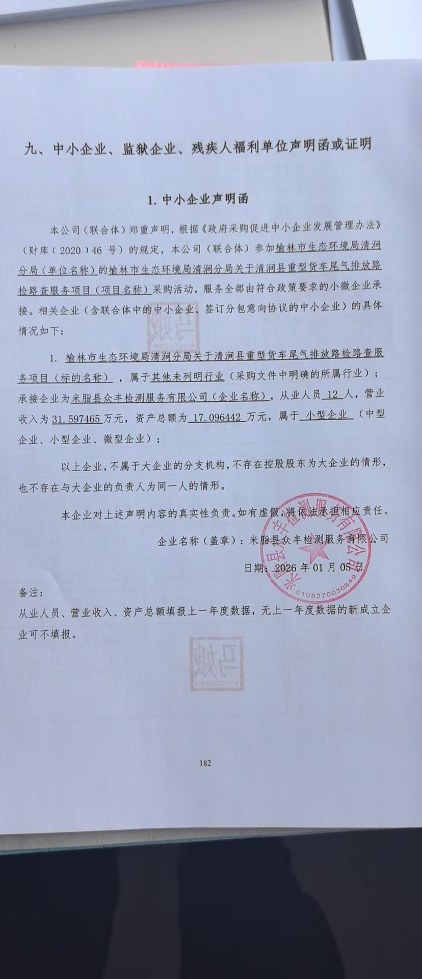 一、项目编号:SXQSYZB-2025-008 二、项目名称:清涧县重型货车尾气排放路检路查服务项目 三、采购结果 采购包1: | 供应商名称 | 供应商地址 | 中标(成交)金额 | 评审总得分 | | 米脂县众丰检测服务有限公司 | 陕西省榆林市米脂县城郊镇官庄村子米路西侧 | 171,980.00元 | 93.33 | 四、主要标的信息 合同包1(榆林市生态环境局清涧分局关于清涧县重型货车尾气排放路检路查服务项目): 服务类(米脂县众丰检测服务有限公司) | 品目号 | 品目名称 | 采购标的 | 服务范围 | 服务要求 | 服务时间 | 服务标准 | 金额(元) | | 1 | 其他生态环境保护和治理服务 | 委托有资质检测机构在清涧县辖区内配合开展路检路查工作,对重型货车尾气排放进行检测,提供检测报告,编制检查清单 | 采购人指定地点 | 符合磋商文件要求 | 1年 | 符合磋商文件要求 | 171,980.00 | 五、评审专家(单一来源采购人员)名单: 六、代理服务收费标准及金额: | 代理服务收费标准及金额 | 参考国家计委颁发的《招标代理服务收费管理暂行办法》(计价格[2002]1980号)、(发改价格[2011]534号)等有关规定的收费标准,以成交价为基数计取。 | | 合同包号 | 合同包名称 | 代理服务费金额(万元) | 收取对象 | | 1 | 榆林市生态环境局清涧分局关于清涧县重型货车尾气排放路检路查服务项目 | 0.2579 | 中标(成交)供应商 | 七、公告期限 自本公告发布之日起1个工作日。 八、其他补充事宜 九、凡对本次公告内容提出询问,请按以下方式联系。 1.采购人信息 名称:榆林市生态环境局清涧分局 地址:清涧县岔口财富广场4楼 联系方式:17868820414 2.采购代理机构信息 名称:陕西乾升垚项目管理有限公司 地址:榆林市高科城A座7楼 联系方式:13474231286 3.项目联系方式 项目联系人:张老师 电话:13474231286 陕西乾升垚项目管理有限公司 2026年01月06日 |
