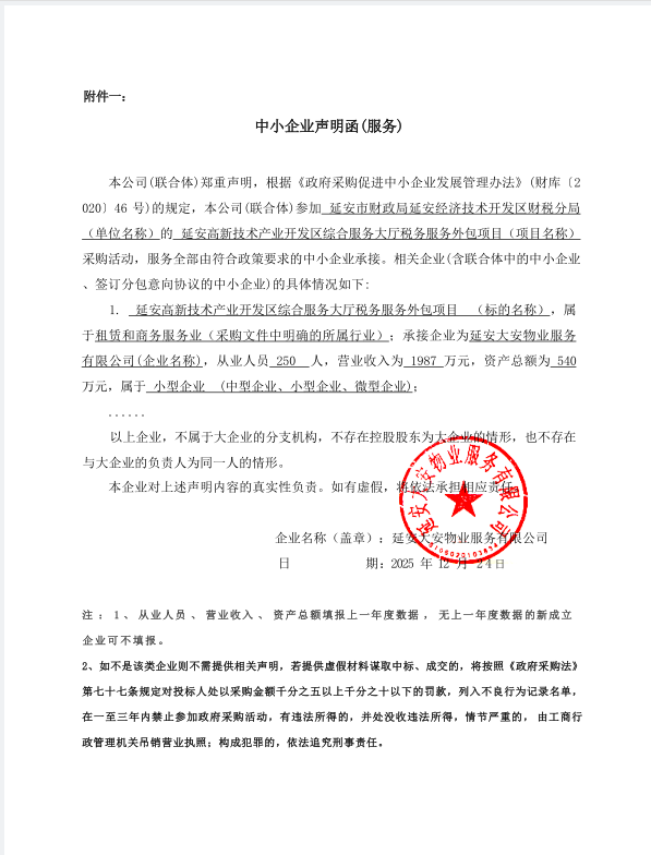 一、项目编号:XD2025-014 二、项目名称:延安高新技术产业开发区综合服务大厅税务服务外包项目 三、采购结果 采购包1: | 供应商名称 | 供应商地址 | 中标(成交)金额 | 评审总得分 | | 延安大安物业服务有限公司 | 陕西省延安市宝塔区高家园则金源宾馆1-101室 | 1,318,604.00元 | 80.61 | 四、主要标的信息 合同包1(延安高新技术产业开发区综合服务大厅税务服务外包项目): 服务类(延安大安物业服务有限公司) | 品目号 | 品目名称 | 采购标的 | 服务范围 | 服务要求 | 服务时间 | 服务标准 | 金额(元) | | 1 | 其他服务 | 劳务服务 | 延安高新技术产业开发区综合服务大厅税务服务外包 | 能严格按照劳务派遣合同约定,每天保质保量提供劳务服务,履行好各自的权利和义务。 | 自合同签订之日起2年 | 符合国家相关合格标准 | 1,318,604.00 | 五、评审专家(单一来源采购人员)名单: 六、代理服务收费标准及金额: | 代理服务收费标准及金额 | 采购代理服务费参考《国家计委关于印发<招标代理服务收费管理暂行办法>的通知》(计价格〔2002〕1980号)中规定的差额定率累进法计取。 | | 合同包号 | 合同包名称 | 代理服务费金额(万元) | 收取对象 | | 1 | 延安高新技术产业开发区综合服务大厅税务服务外包项目 | 1.7548 | 中标(成交)供应商 | 七、公告期限 自本公告发布之日起1个工作日。 八、其他补充事宜 九、凡对本次公告内容提出询问,请按以下方式联系。 1.采购人信息 名称:延安市财政局延安经济技术开发区财税分局 地址:延安市高新区创新大道综合服务中心 联系方式:18091111771 2.采购代理机构信息 名称:陕西轩鼎项目管理有限公司 地址:延安市新区上城叁号三号楼一单元302室 联系方式:0911-8899885 3.项目联系方式 项目联系人:杨工 电话:0911-8899885 陕西轩鼎项目管理有限公司 2026年01月06日 |