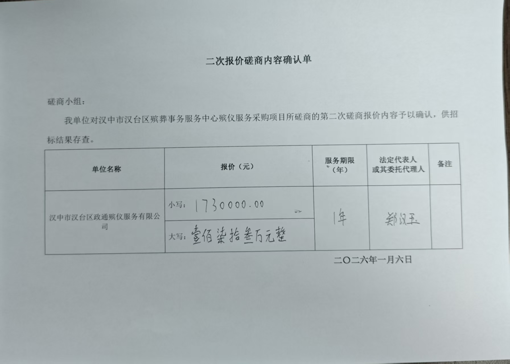 公告概要:| 公告信息: | | 采购项目名称 | 汉中市汉台区殡葬事务服务中心殡仪服务采购项目 | | 品目 | | | 采购单位 | 汉中殡仪馆 | | 行政区域 | 汉台区 | 公告时间 | 2026年01月07日 15:18 | | 评审专家(单一来源采购人员)名单 | 赵红霞,晏瑞,王波 | | 总成交金额 | ¥173.000000 万元(人民币) | | 联系人及联系方式: | | 项目联系人 | 王先生 | | 项目联系电话 | 0916-2610065 | | 采购单位 | 汉中殡仪馆 | | 采购单位地址 | 汉台区老君转盘西侧200米 | | 采购单位联系方式 | 吴女士 0916- 2212677 | | 代理机构名称 | 一鼎项目管理有限公司 | | 代理机构地址 | 汉中市汉台区石马路睿居品阁酒店17楼06室 | | 代理机构联系方式 | 0916-2610065 | | 附件: | | 附件1 | 汉中殡仪馆汉中市汉台区殡葬事务服务中心殡仪服务采购项目中标(成交)明细.pdf | | 附件2 | 二次报价表.jpg | | 附件3 | 磋商文件.pdf | | 附件4 | 中小企业声明函.jpg |