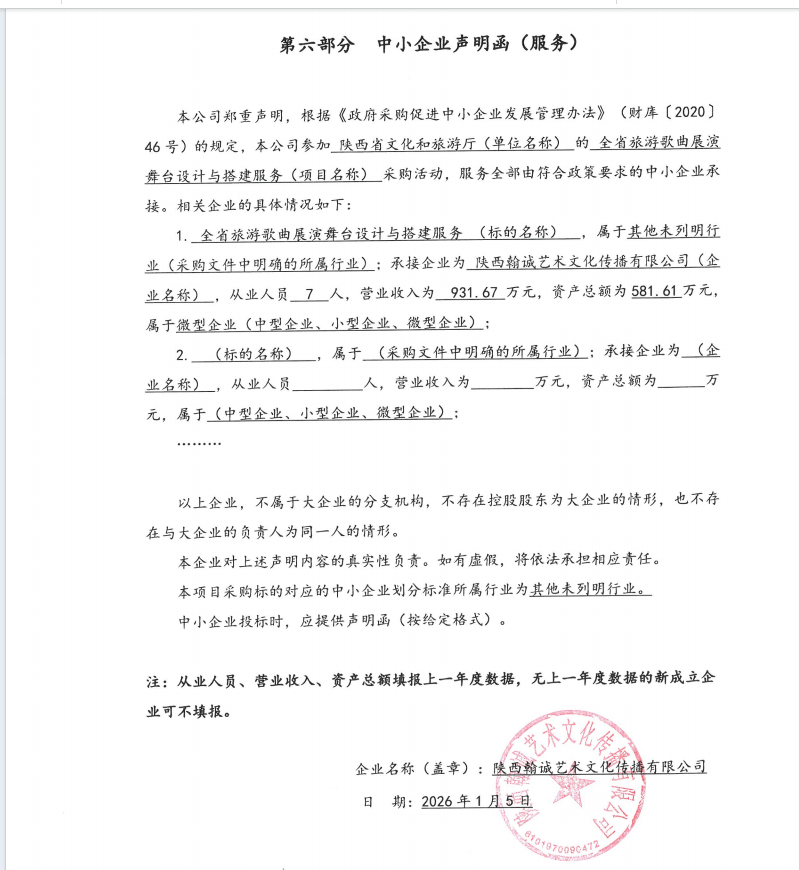 一、项目编号:ZJZBSX-251220-0020 二、项目名称:全省旅游歌曲展演舞台设计与搭建服务 三、采购结果 采购包1: | 供应商名称 | 供应商地址 | 中标(成交)金额 | 评审总得分 | | 陕西翰诚艺术文化传播有限公司 | 陕西省西安市未央区浩华北郡北区7号楼1单元1904室 | 245,500.00元 | 97.96 | 四、主要标的信息 合同包1(全省旅游歌曲展演舞台设计与搭建服务): 服务类(陕西翰诚艺术文化传播有限公司) | 品目号 | 品目名称 | 采购标的 | 服务范围 | 服务要求 | 服务时间 | 服务标准 | 金额(元) | | 1 | 其他文化、体育、娱乐服务 | 全省旅游歌曲展演舞台设计与搭建服务项目 | 响应磋商文件服务内容 | 响应磋商文件服务要求 | 2026年1月15日 | 合格 | 245,500.00 | 五、评审专家(单一来源采购人员)名单: 六、代理服务收费标准及金额: | 代理服务收费标准及金额 | 招标代理服务费(即中标服务费)由中标单位支付,收费标准参照中华人民共和国国家计划委员会计价格[2002]1980号文计算收取;不足伍仟元按伍仟元收取。 | | 合同包号 | 合同包名称 | 代理服务费金额(万元) | 收取对象 | | 1 | 全省旅游歌曲展演舞台设计与搭建服务 | 0.5 | 中标(成交)供应商 | 七、公告期限 自本公告发布之日起1个工作日。 八、其他补充事宜 九、凡对本次公告内容提出询问,请按以下方式联系。 1.采购人信息 名称:陕西省文化和旅游厅机关 地址:西安市碑林区长安北路15号 联系方式:029-85217977 2.采购代理机构信息 名称:陕西中经招标有限公司 地址:长安北路8B陕西高速大厦16层 联系方式:029-87888601-8011 3.项目联系方式 项目联系人:张锦、盖莲花、郭燕妮 电话:029-87888601-8011 陕西中经招标有限公司 2026年01月08日 |