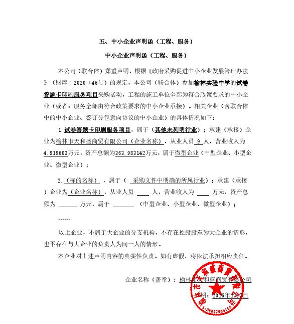 榆林实验中学试卷答题卡印刷服务项目中标(成交)结果公告